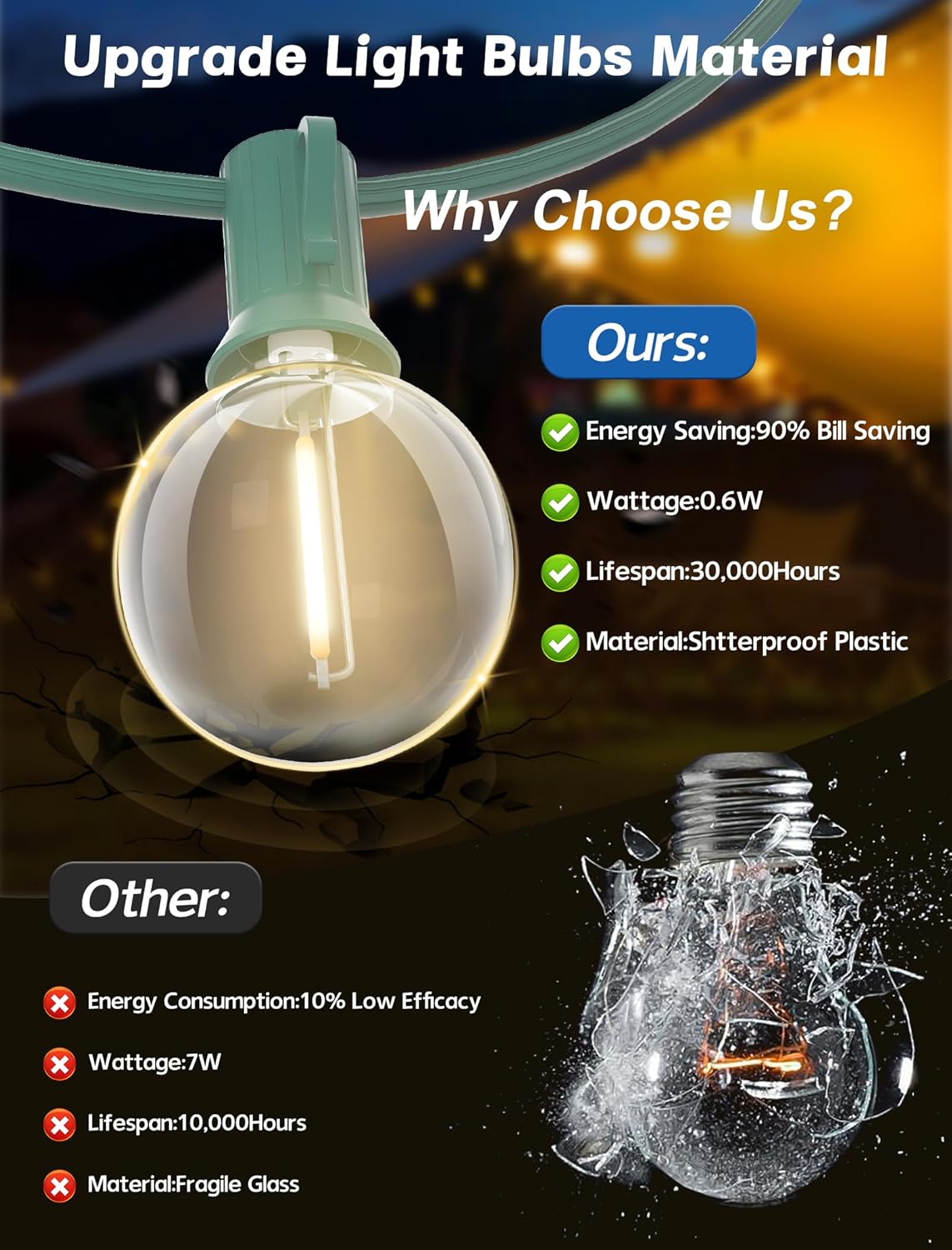 - Decorative Globe String Lights: This G40 Retro Christmas Lights can send warm white light when you install it in the garden, tents, courtyard, making your mood very happy. Outdoor globe lights are the perfect decoration for bedroom, living room and outside space like rooftops, deck, tent, porch, pergola, market, umbrella, balcony. Add relaxed and romantic ambience to your party, camping, wedding