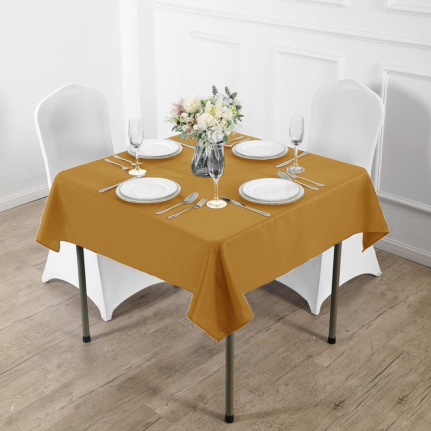 Fokitut 2 Pack Waterproof Square Tablecloth, 90x90 Inch, Stain Resistant and Wrinkle Polyester Table Cloth, Fabric Table Cover for Kitchen Dining, Wedding, Party, Holiday Dinner-Gold