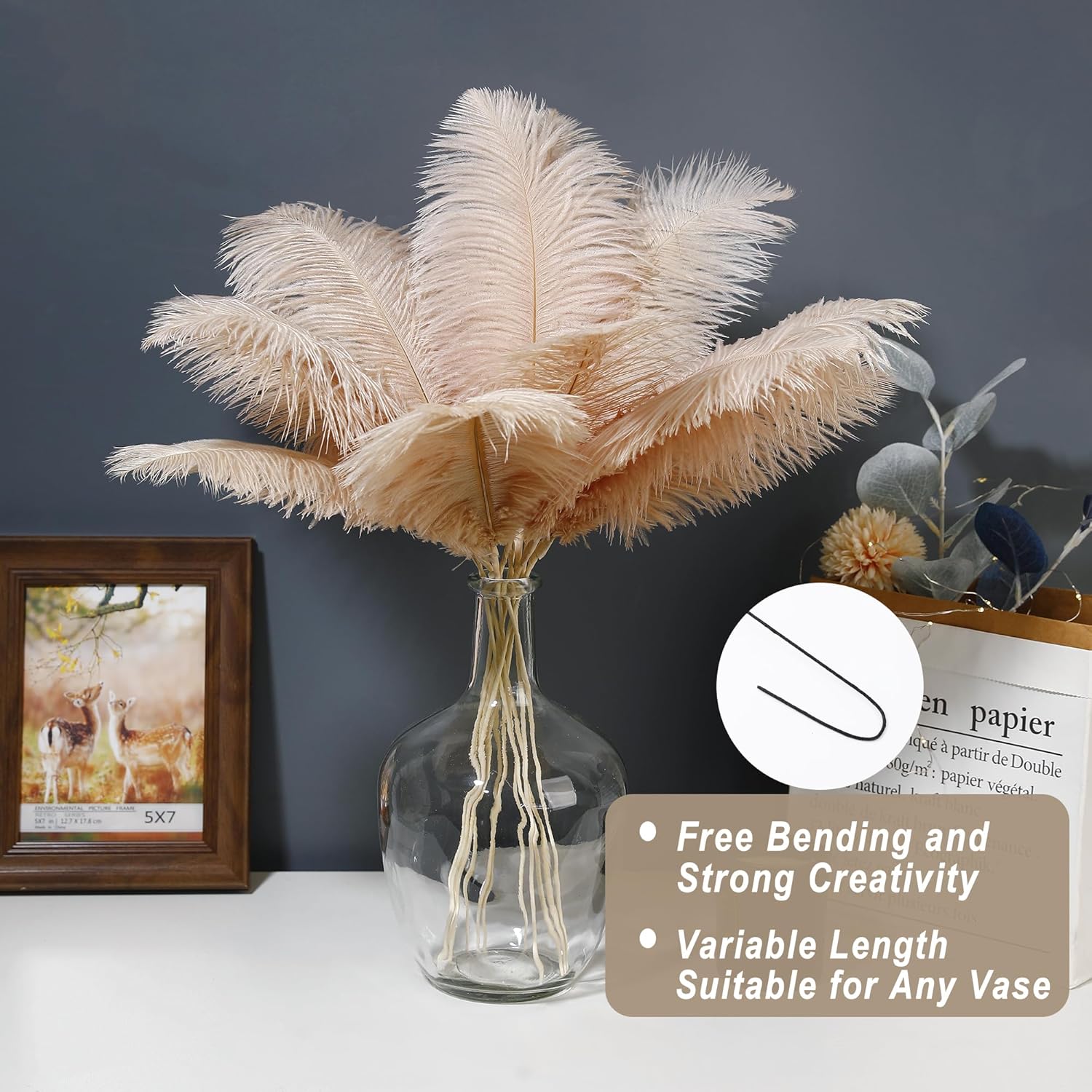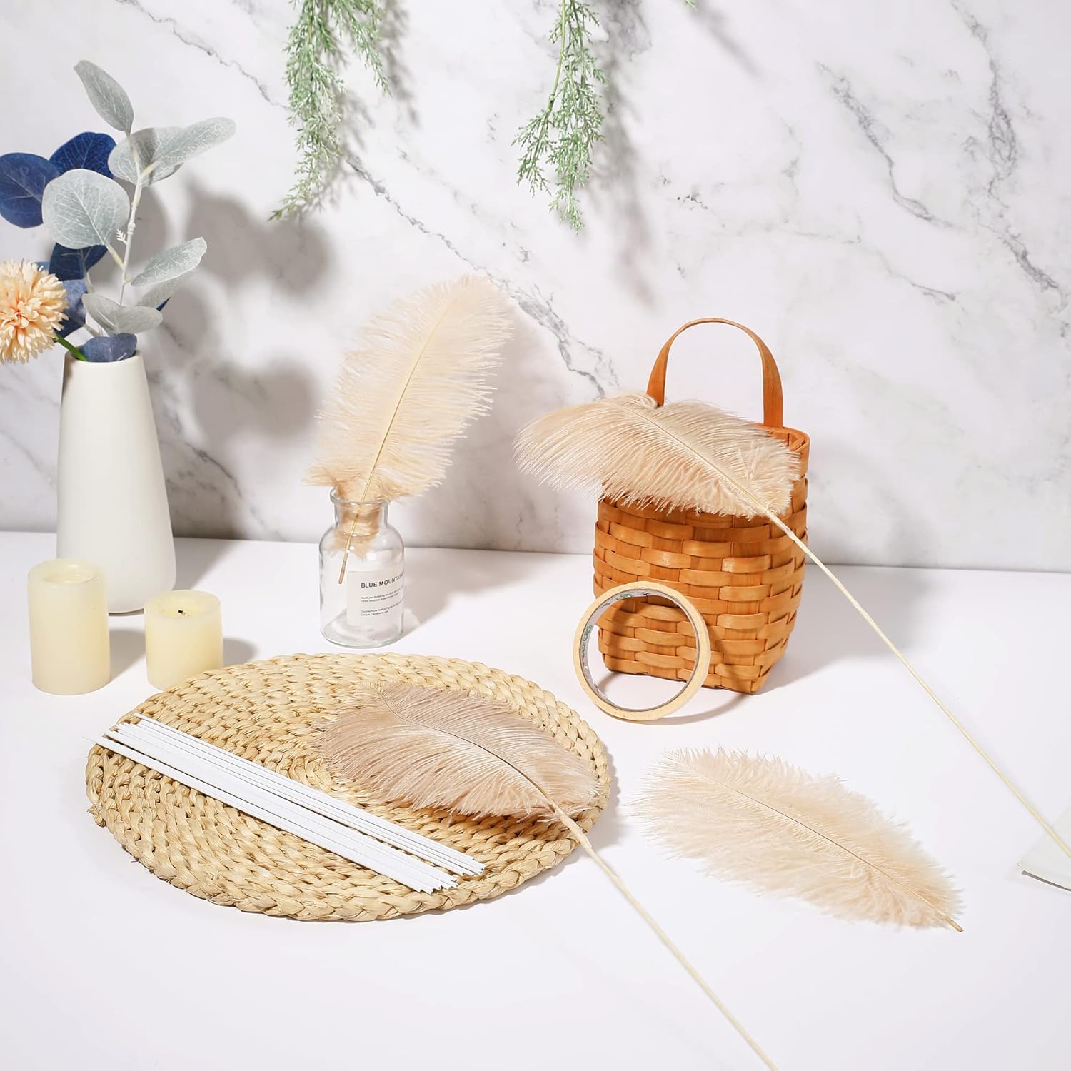 - 22inch Ostrich Feathrs Kit: 20pcs 10-12 inches champagne ostrich feathers, 20 pcs 10 inches long iron wire, and a 15m tape in the same color with the feather. Rich set content to meet your decoration and use needs