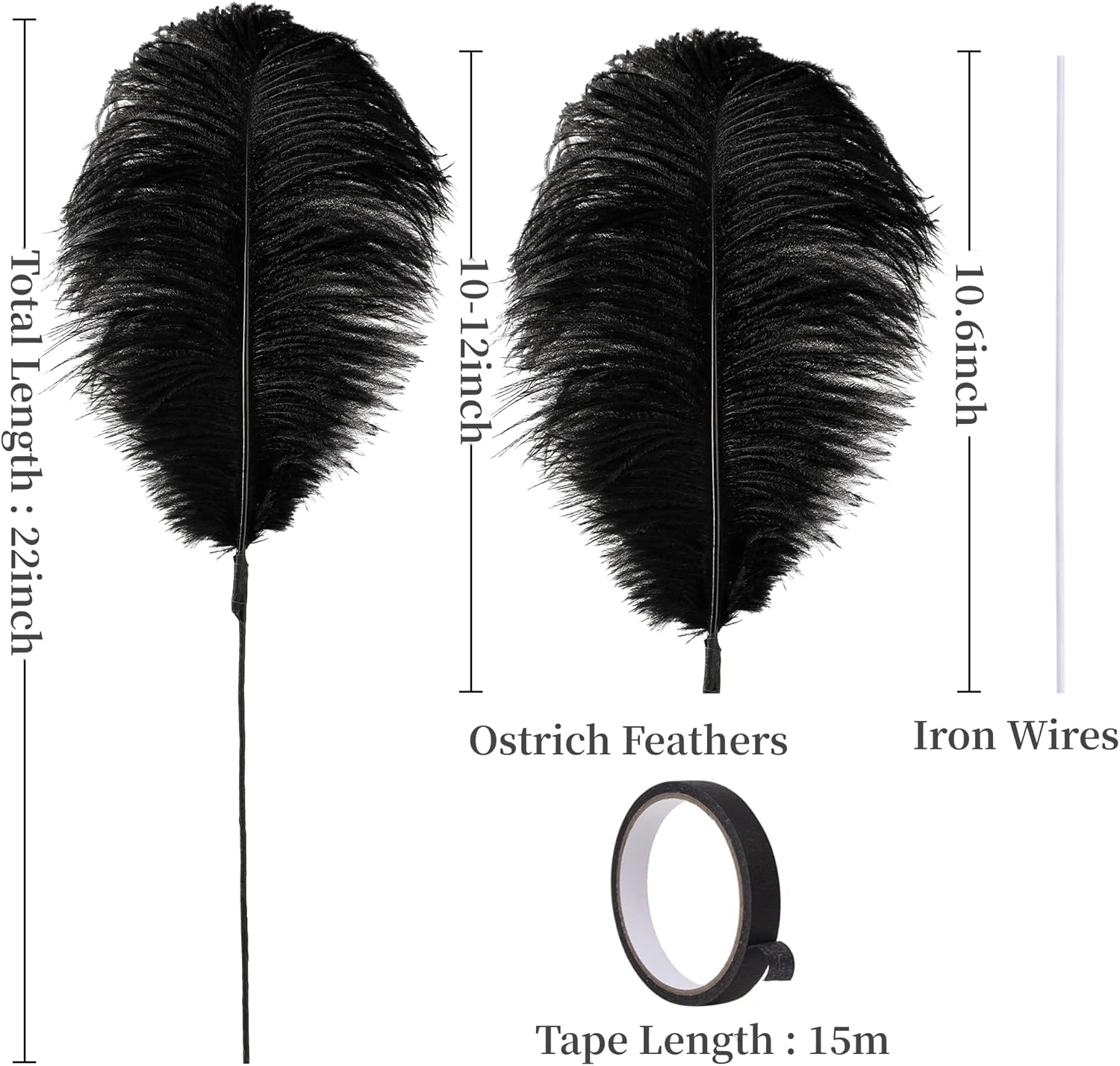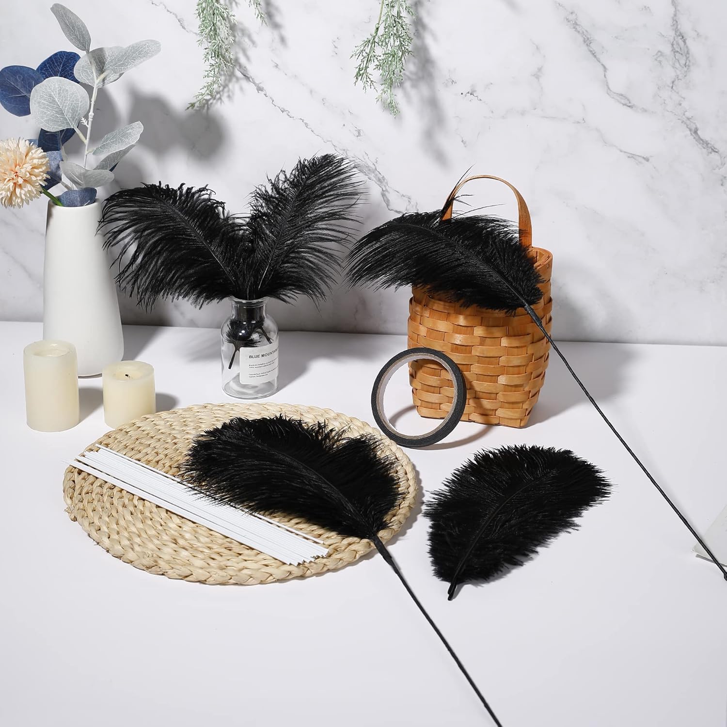 - 22inch Ostrich Feathrs Kit: 20pcs 10-12 inches black ostrich feathers, 20 pcs 10 inches long iron wire, and a 15m tape in the same color with the feather. Rich set content to meet your decoration and use needs