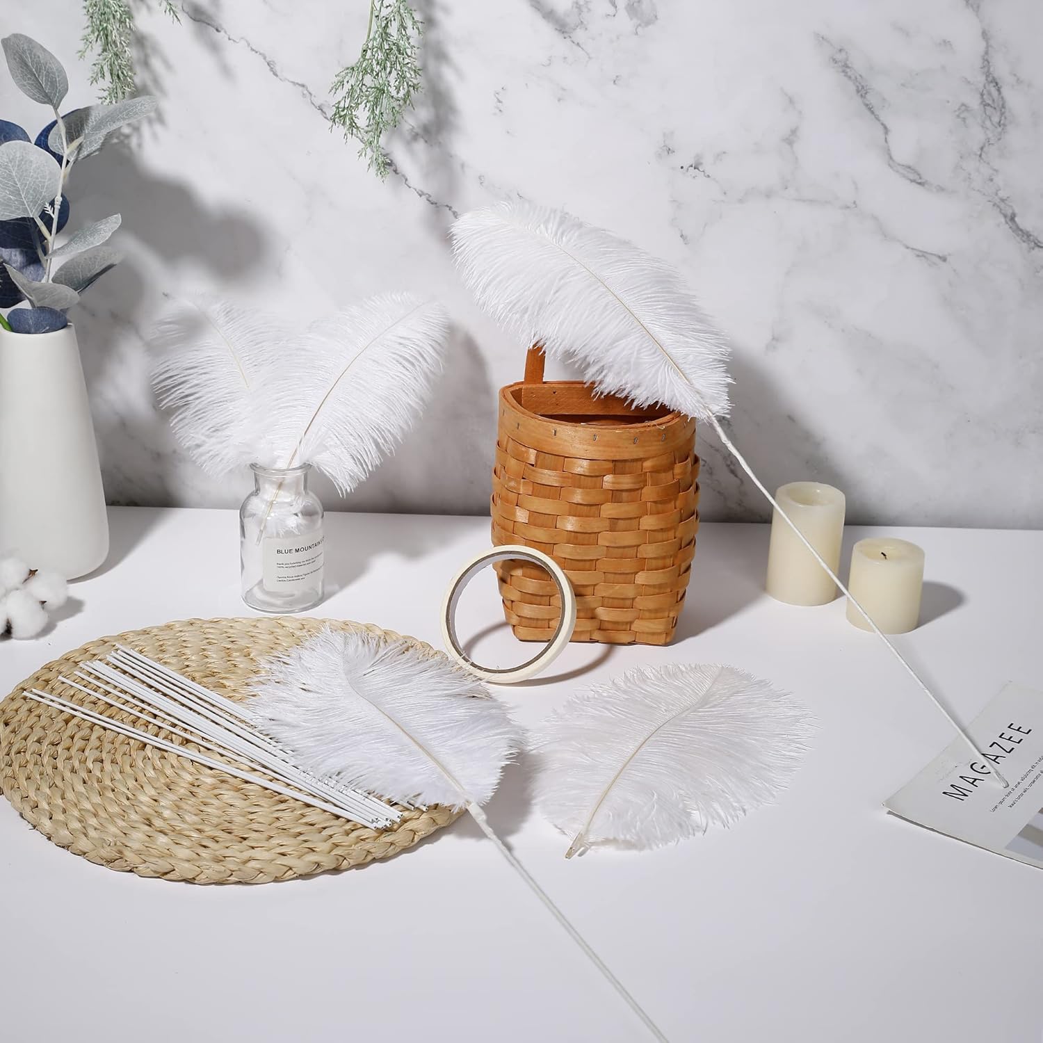 - 22inch Ostrich Feathrs Kit: 20pcs 10-12 inches white ostrich feathers, 20 pcs 10 inches long iron wire, and a 15m tape in the same color with the feather. Rich set content to meet your decoration and use needs