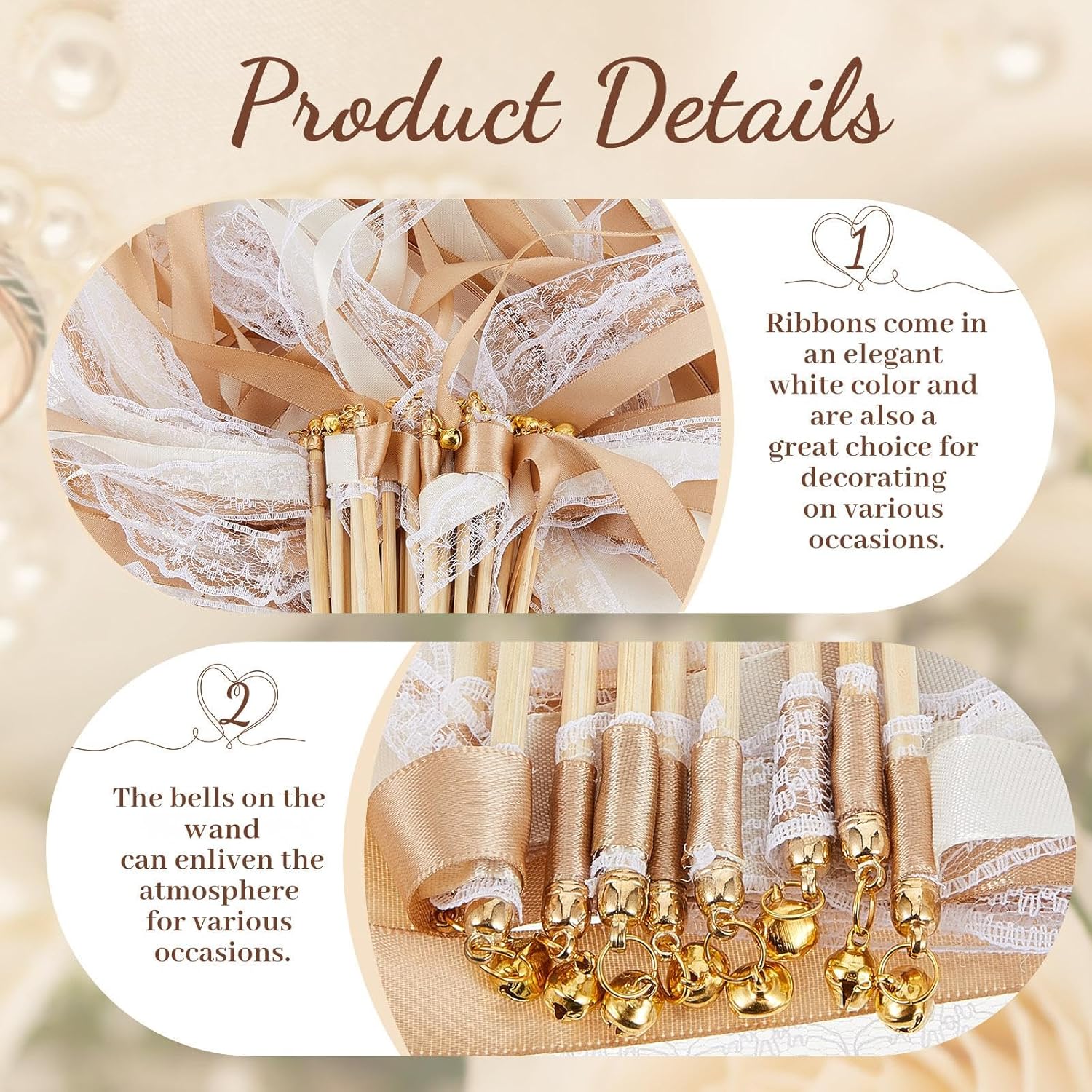 - Large Quantity: the package contains 150 pieces of wedding wands, with champagne and beige ribbons, white lace, bells, enough for you to decorate an impressive wedding or party; You can also share them with your family and mates