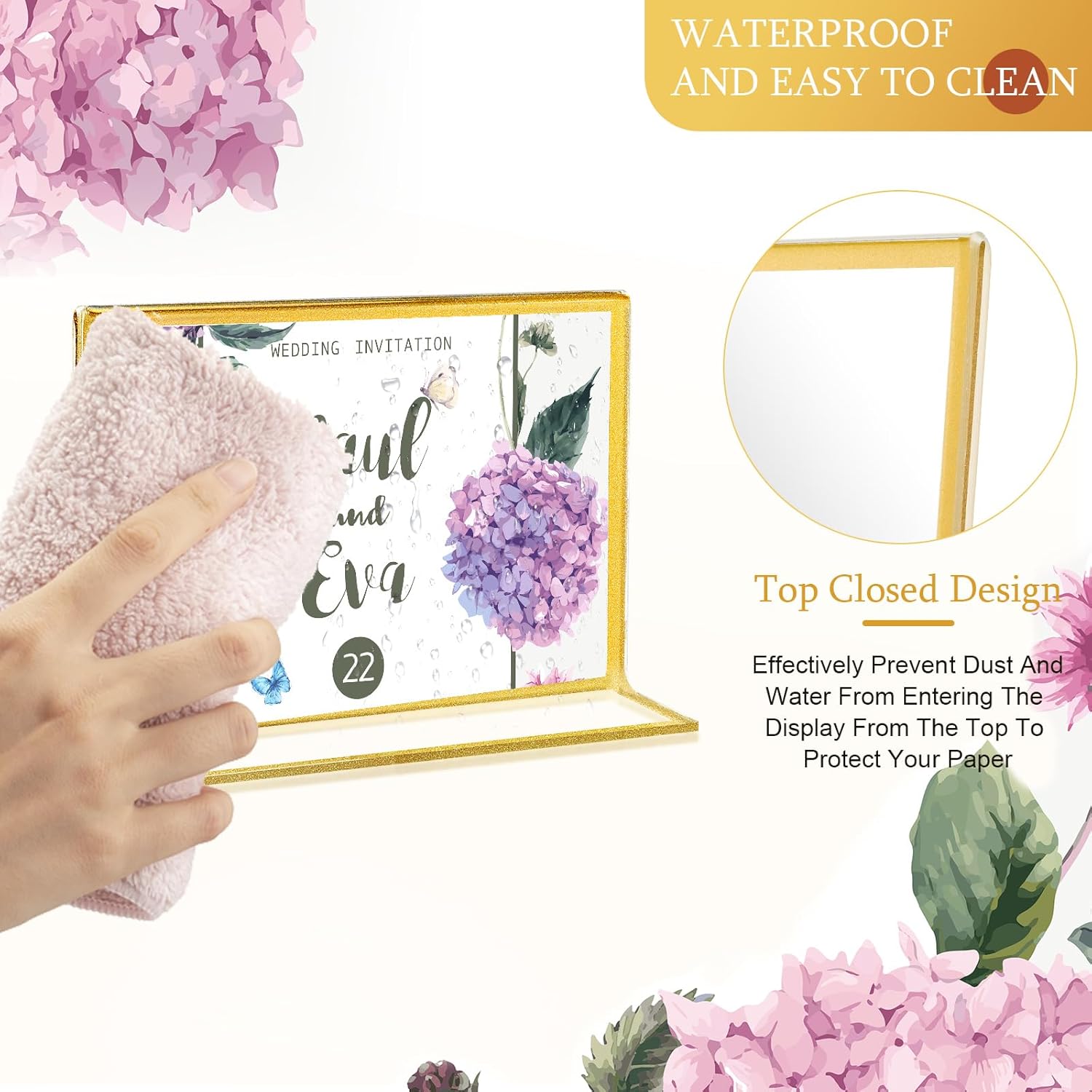 - Stable, Elegant & Eye-Catching: Featuring a sturdy L-shaped base and refined gold-edged trim, this acrylic frames stays securely in place while enhancing any display. Perfect for weddings, restaurants, business events, retail stores, and receptions