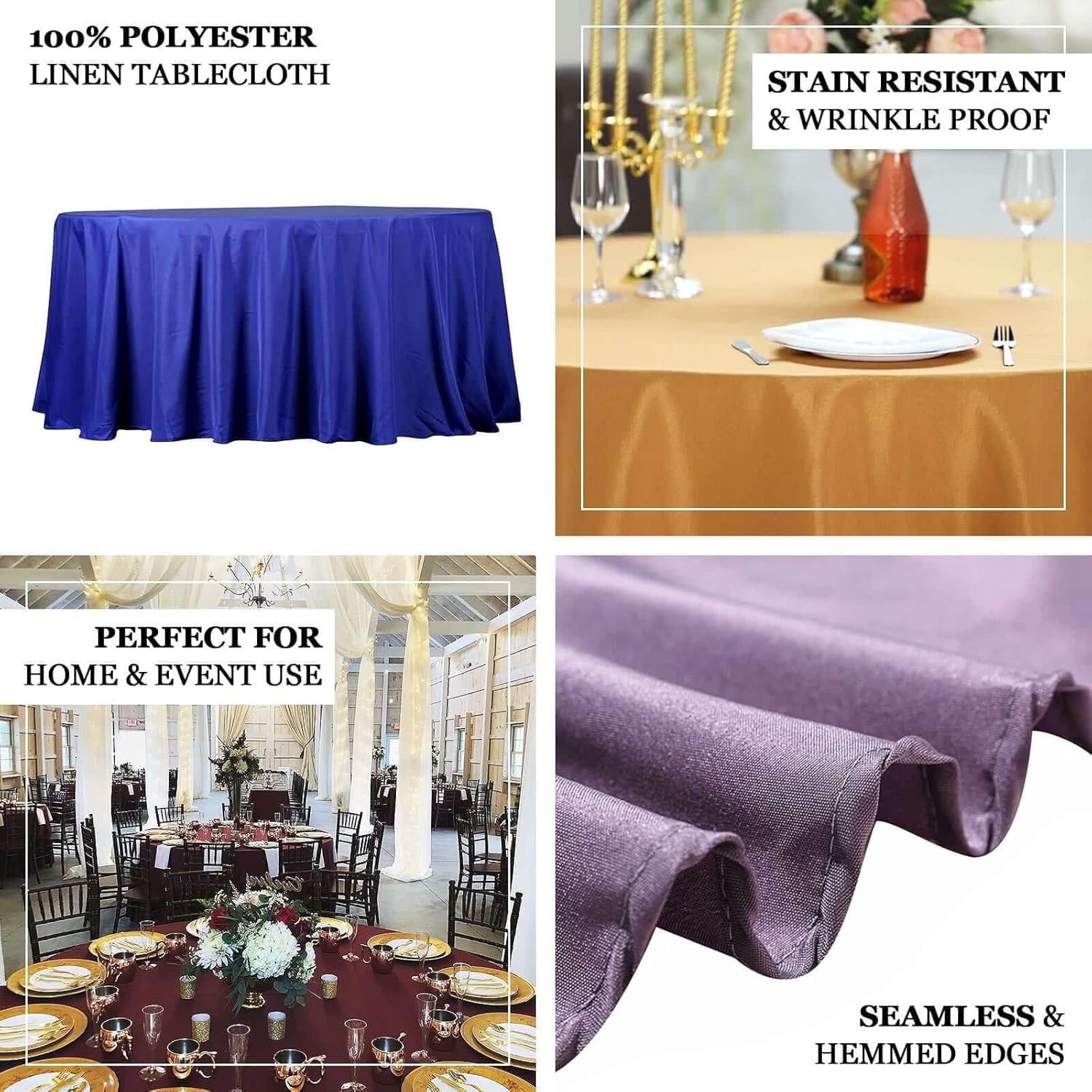 - Quantity: 1 Tablecloth Material: 100% Polyester Color: Lavender Size: 132" Dia. 1 pc, seamless design Stain & Wrinkle Resistant, Machine Washable Hemmed edges for an exquisite look. Gives floor length hang on standard 6 ft (72") tables
