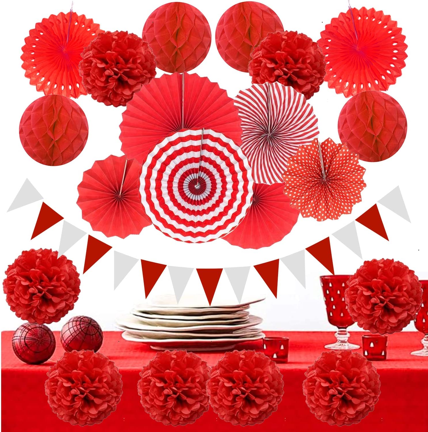 - Includes: 1 x 6.5ft Triangular pennants, 8 x 10inch/25cm Paper pompoms, 6 x 10inch/25cm Paper fans, 4 x Paper hollow fans, 2 x 6.5ft Circle Paper Garland. ( Color: Red)