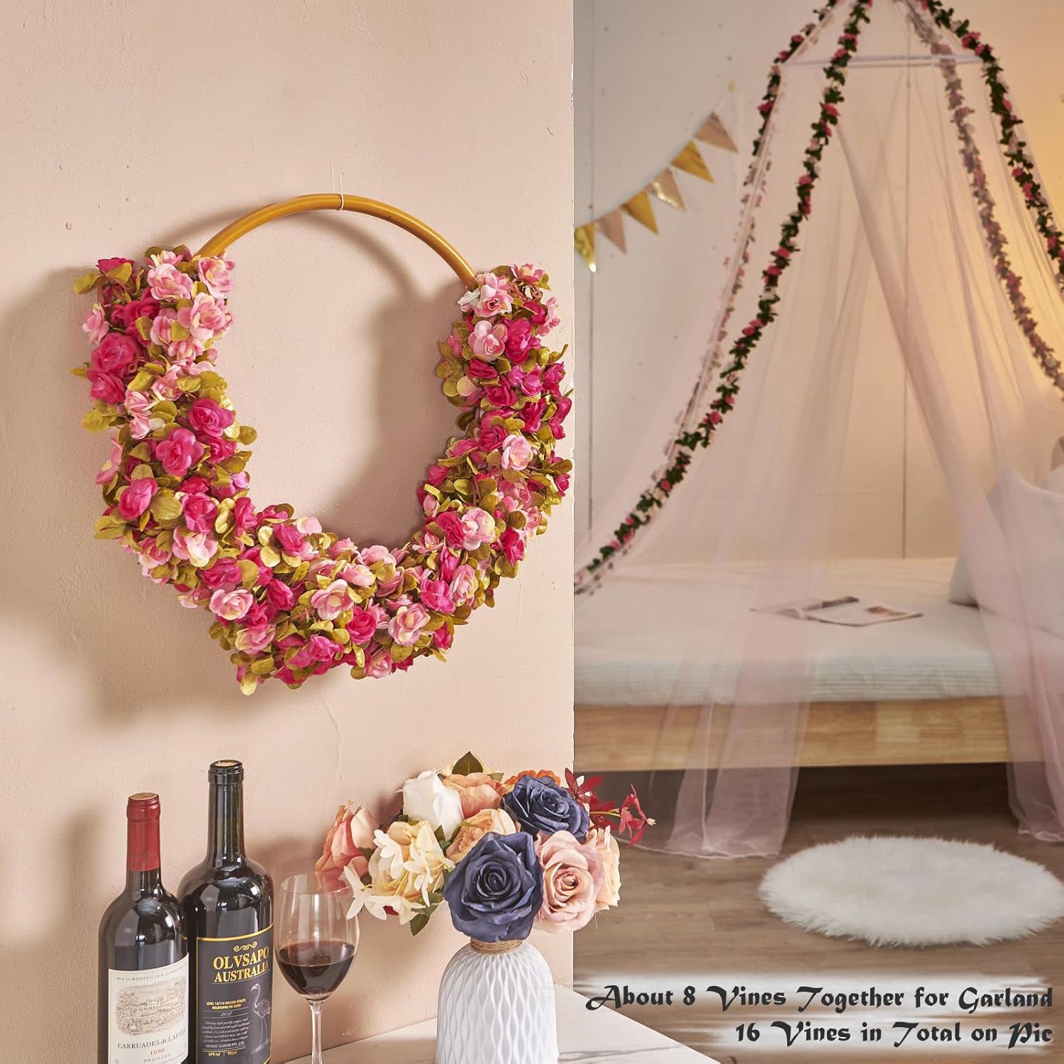 - Material & Features: PONKING fake rose garland is made of silk and plastic. Durable silk and plastic flowers ensures durability and no risk of leaves or flowers dying. The rose vine spares you from endless watering. Different from real rose flowers, our artificial vines with rich color layers and natural appearance will never fade. They will last forever. Nice choice for your daughter's bedroom