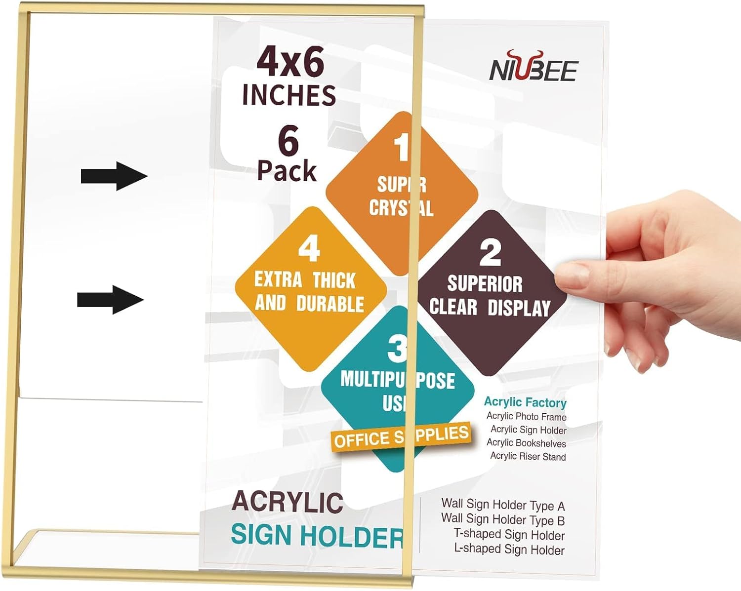 NIUBEE 4 x 6 Gold Frames, 6 Pack Acrylic Slanted Back Gold Picture Frames for Wedding Table Numbers, Restaurant Signs, Photos, Perfect for Wedding, Party, Event