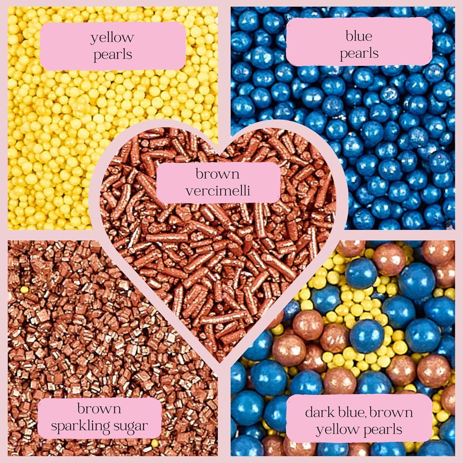 Sprinkles - Confect Sprinkles for Cakes & Cupcakes Decoration Assorted pack of 5 ?Graduation Day Mix Yellow, Copper & Navy Blue Pearl Dragees Copper Jimmies Bronze Sparkling Sugar | Vegan, Gluten-Free, Nut-Free, Soy-Free, Dairy-Free, Palm Oil-Free- 5 Oz