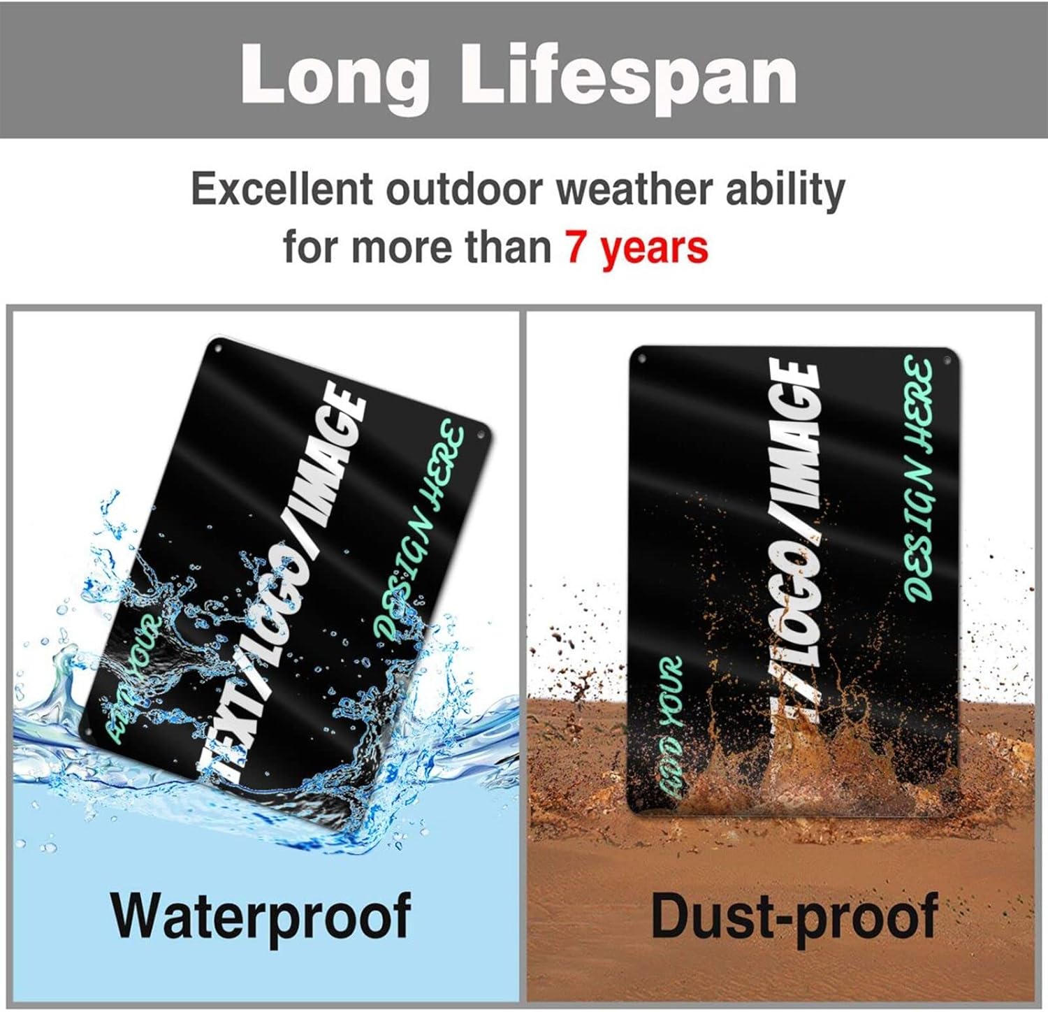 - Our metal signs are made of high-quality aluminum metal, it is rust-proof and durable, can be used for a long time and the text is clear and easy to read. The surface of the sign has a protective coating to withstand sun, snow, rain and cold.