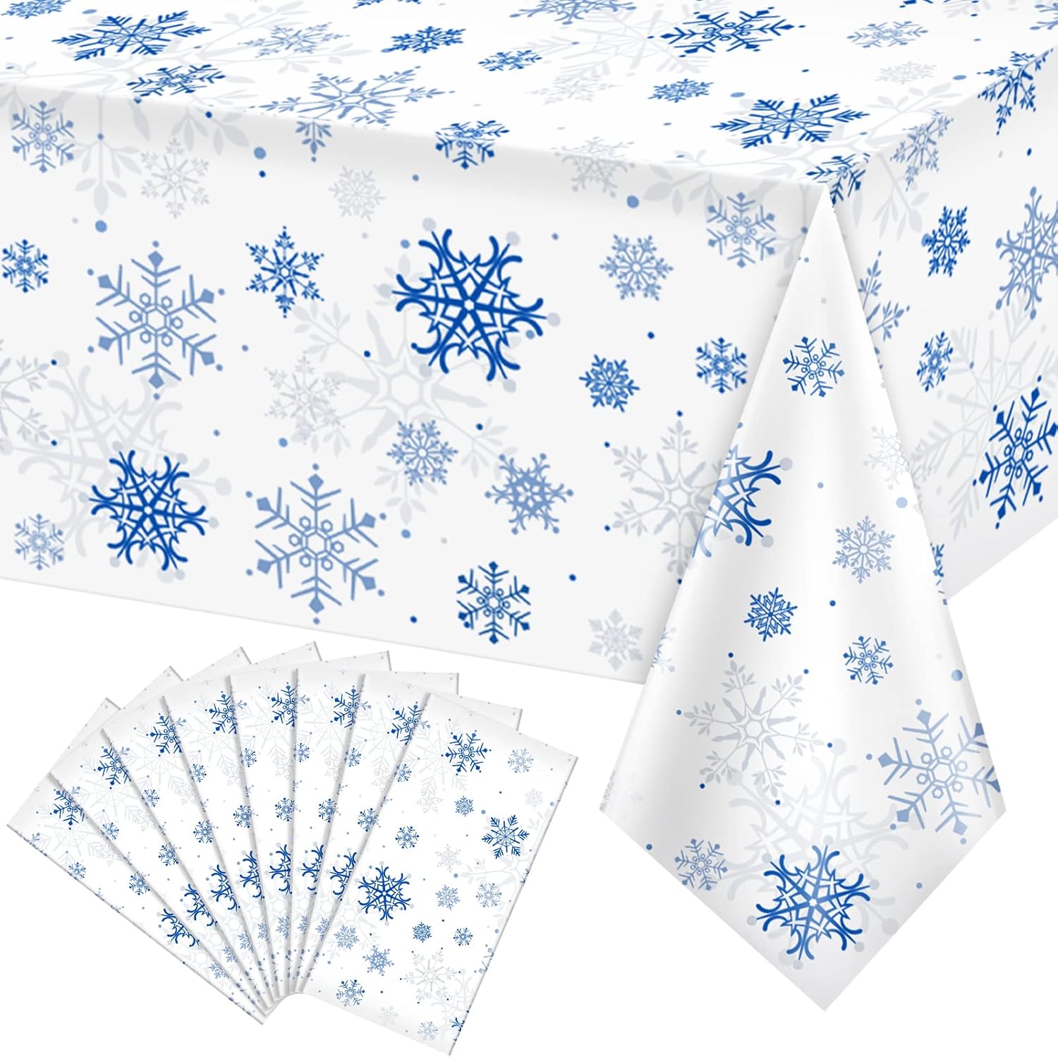 - What will you receive:8 pieces rectangular christmas party tablecloth,all over printed with ice blue snowflake patterns on white backdrop,ideal for decorating your winter holiday and Christmas party supplies and decorations