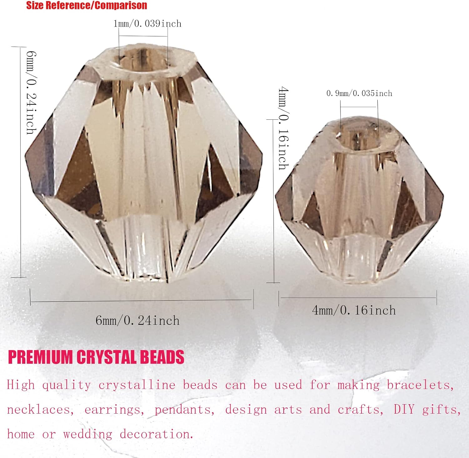 - 【PACKAGING and SIZE】 Package includes 450Pcs 6mm Bicone faceted crystal glass beads in silver champagne AB color. Bead size: 6mm (or ~ 0.24 inch); Hole diameter ~ 1mm ( ~ 0.039 inch).In addition, we provide you with some stretchy cord and add an organza bag.Let your family and friends enjoy DIY happy time together.Kindly note: Please make sure this bead size meets your needs before placing an order,thank you.
