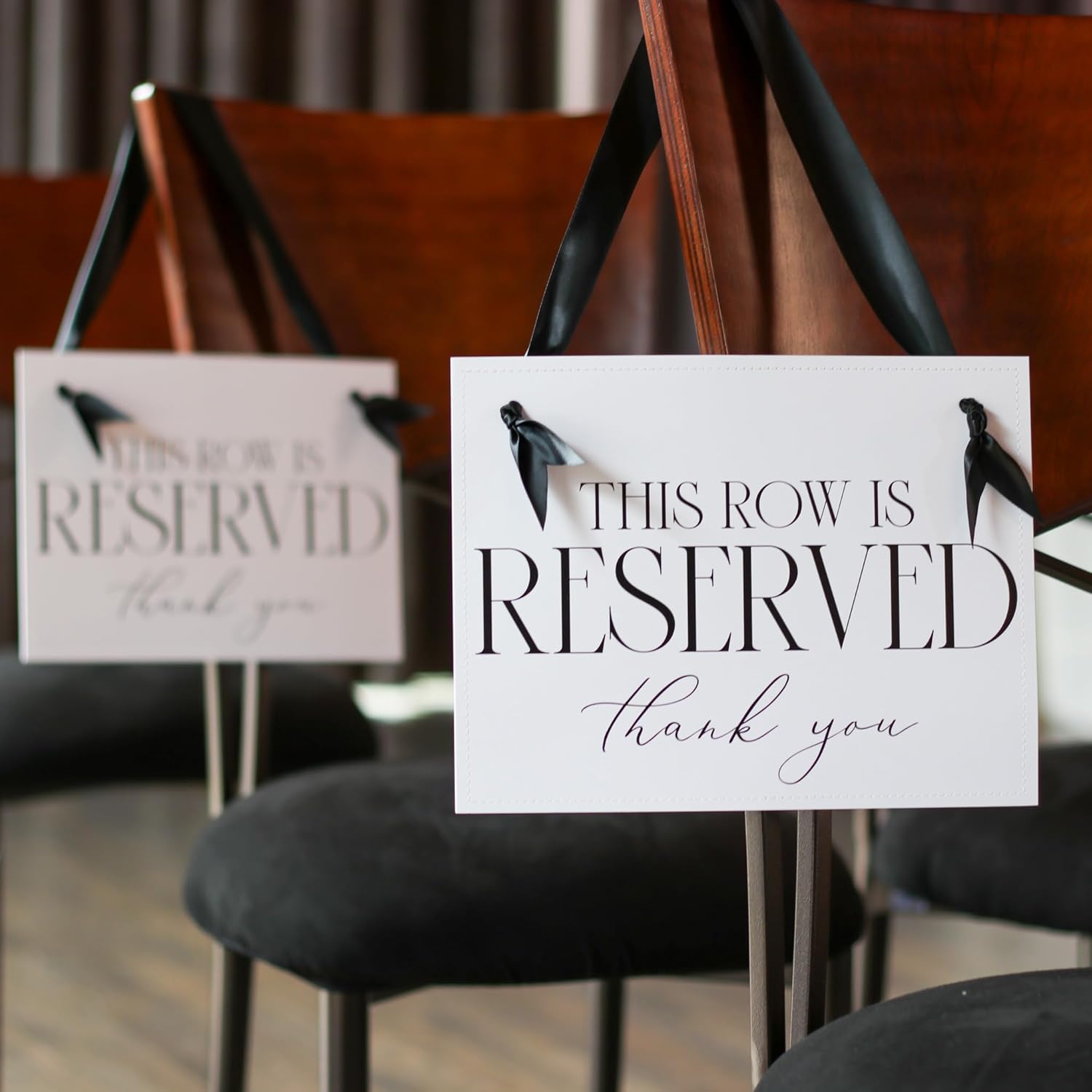 Ritzy Rose Set of 2 Reserved Row Sign for Wedding Ceremony Chairs or Events - Thick Paper Banner for Seating - White Linen Cardstock with Black Font and Black Satin Ribbon - 11x8.5 inches