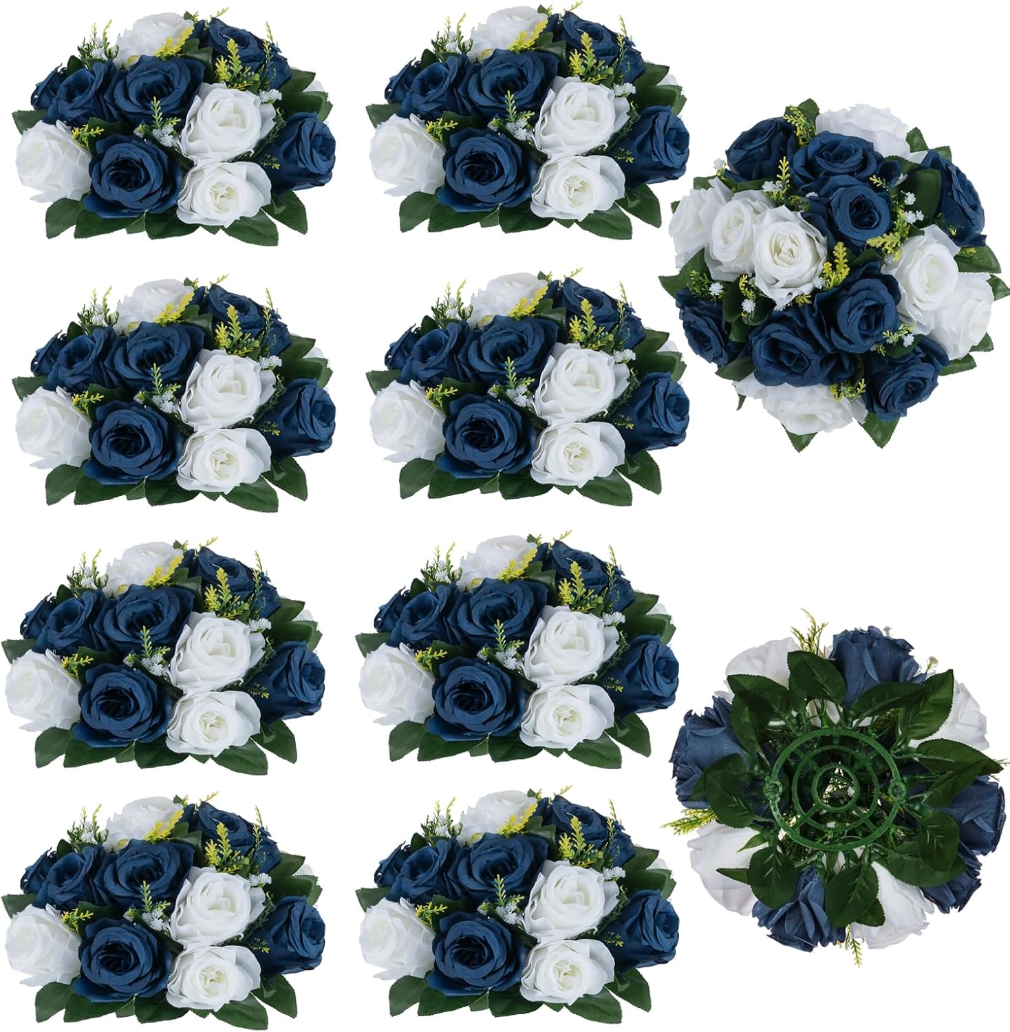 - 3-in-1 Centerpieces Table Decoration: Each piece measures 9.5 inches by 4.7 inches. These navy blue white flower ball arrangements for centerpieces offer multiple setup options thanks to a 10 cm diameter patented base, which allows for direct placement on tables or compatibility with most stands and vases. They come with free zip ties, enabling you to join two halves together to form a full flower ball or hang them in any desired location