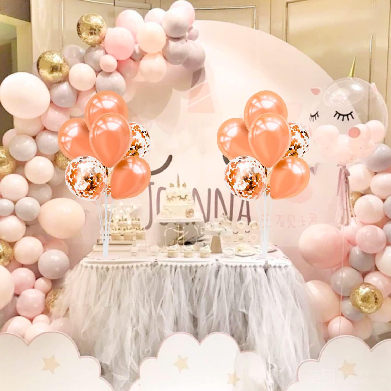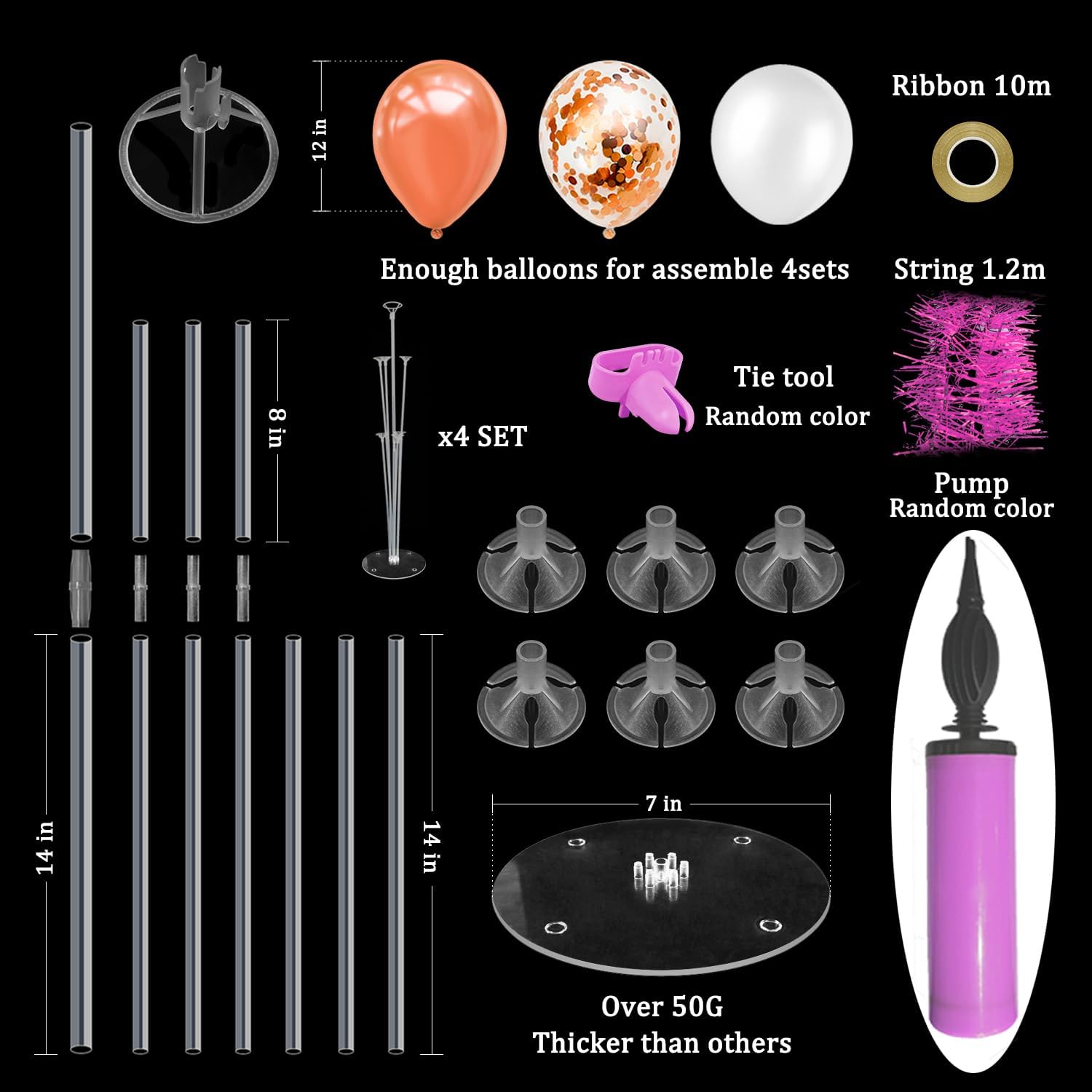 - WHAT INLCUDE: This balloon stand kit include 4 set balloon holders, 35pcs balloons - rose gold and confetti balloons, white balloons, balloon pump, ribbons, glue dots and tie tool