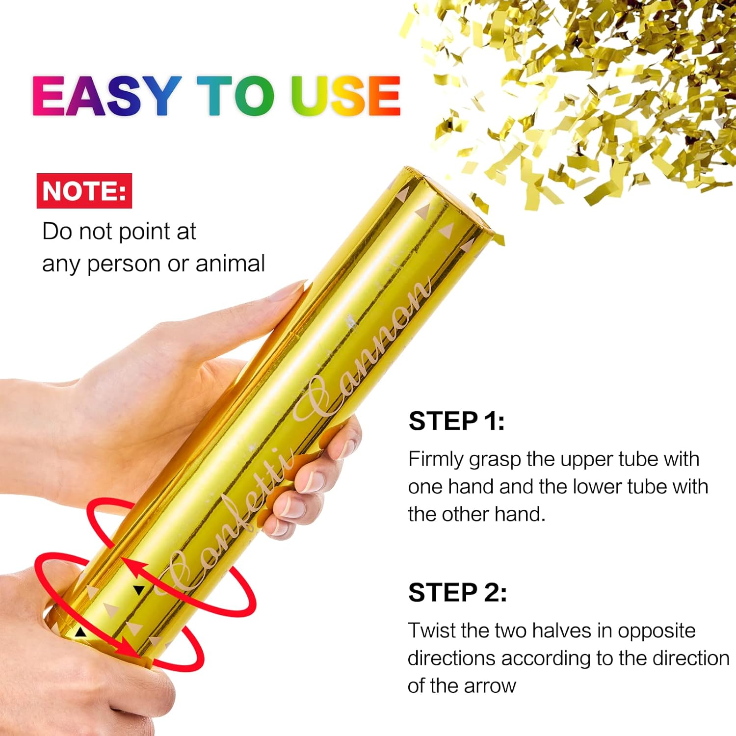 - BEFORE USE CONFETTI POPPERS - Please read the instructions and tear open the packaging paper at the bottom of the popper, then easy to twist it! In order to provide you with a better experience with confetti cannon and avoid being unable to twist.