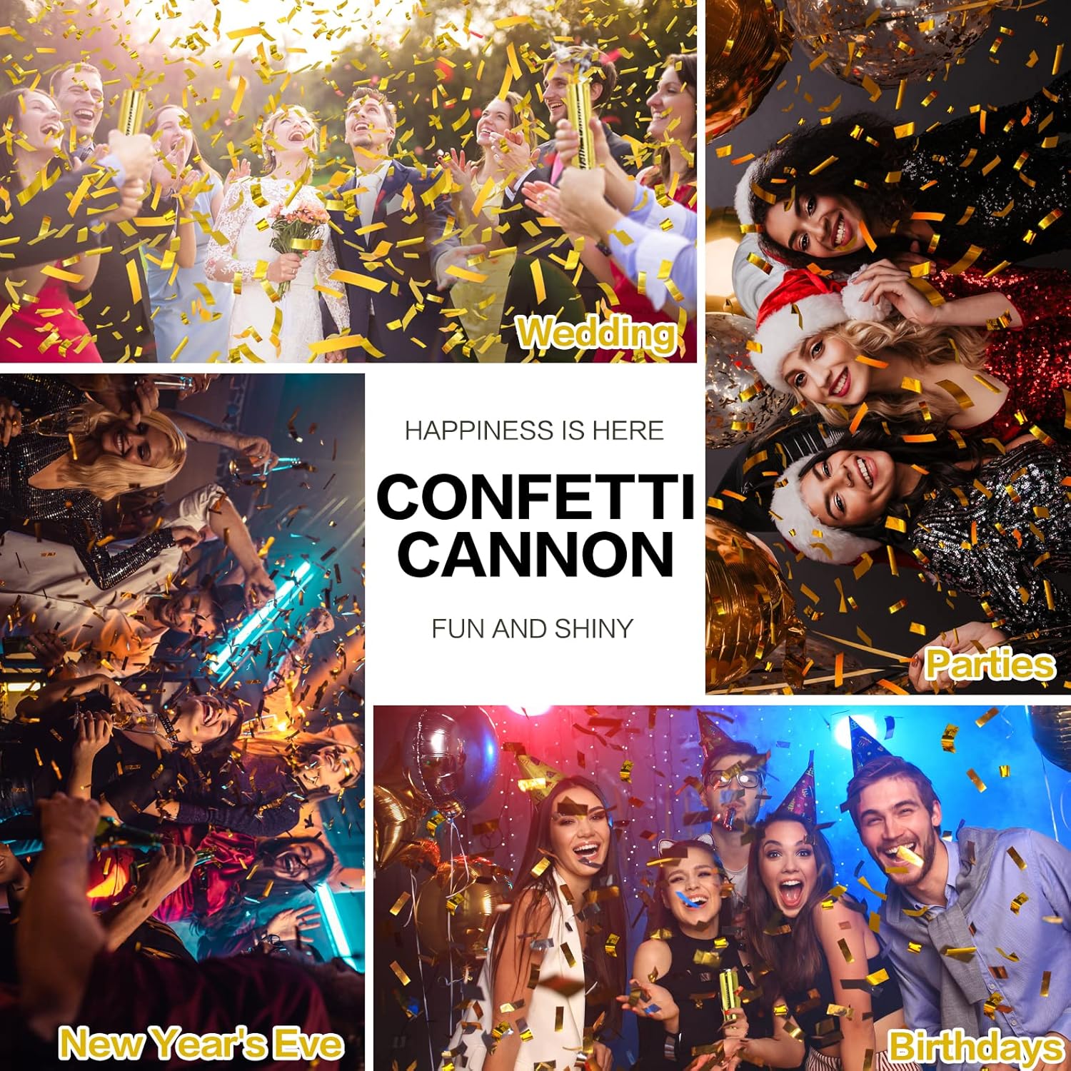 - Party Confetti Cannon for Any Events - A great way to add fun, festive energy to any party or gathering. These gold confetti poppers cannon are perfect for weddings, graduation,birthday party, Christmas, family reunions, or any event where you want to up the glam factor!