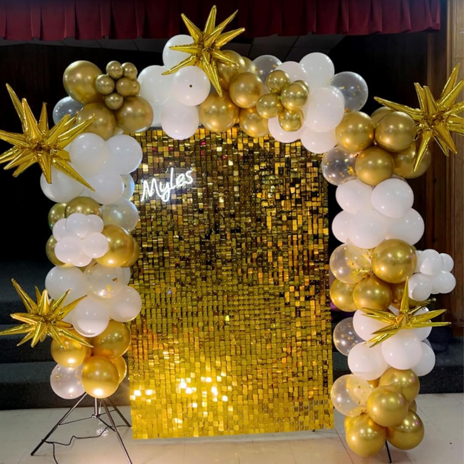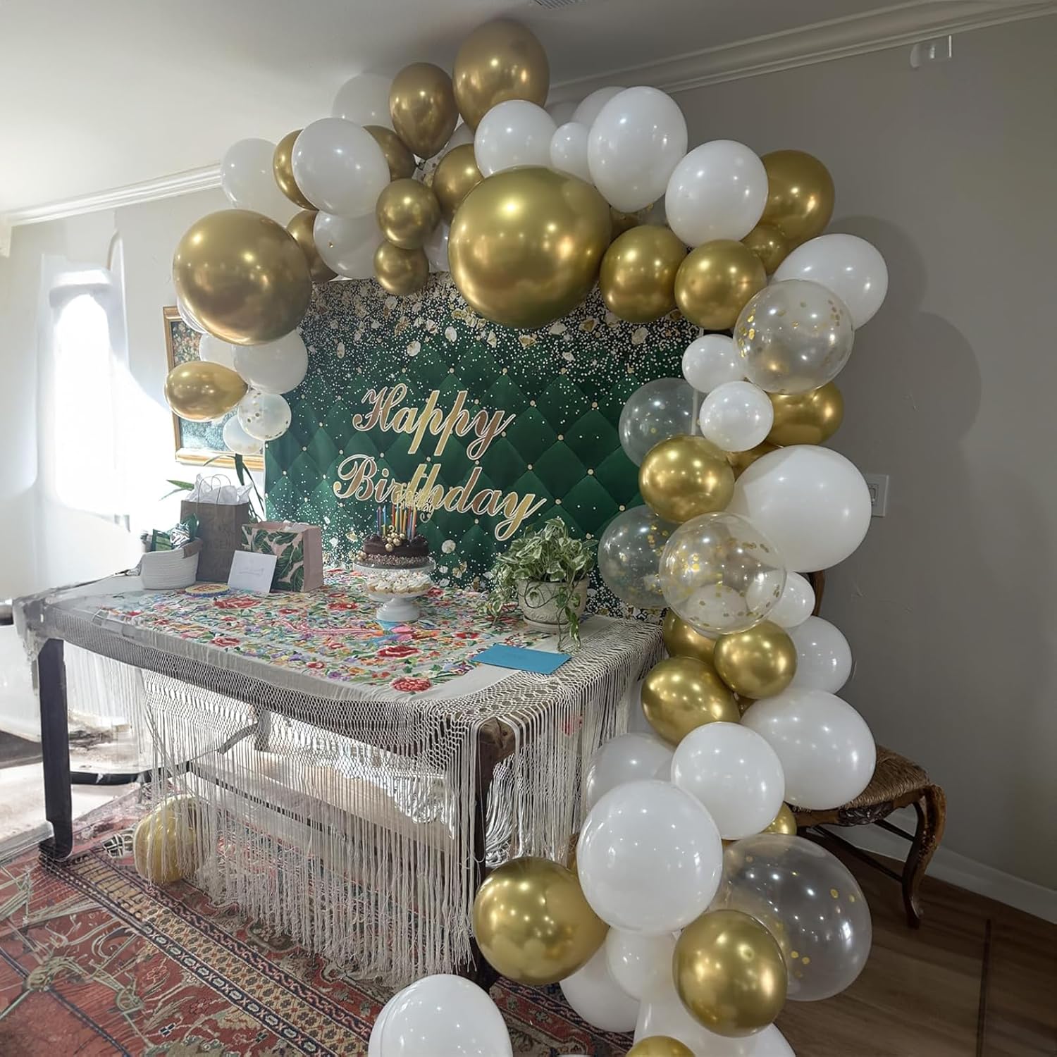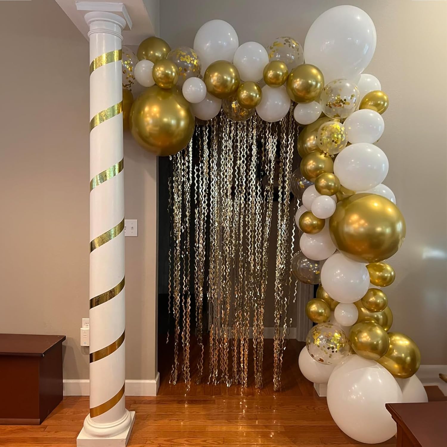 - Includes 60 white latex balloons and gold metallic balloons with 2 curling ribbons