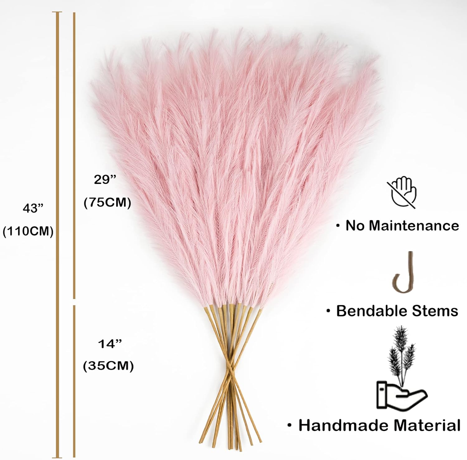 - High End Looking Faux Pampas Grass: It's actually made of a metal wire in the stem and silk feather, it holds shape very well. The pompass grass branches tall bulk is really soft and feather-like, with 15 branches on each stem, and the heads of each stem are designed so you can fluff them up for a fuller look