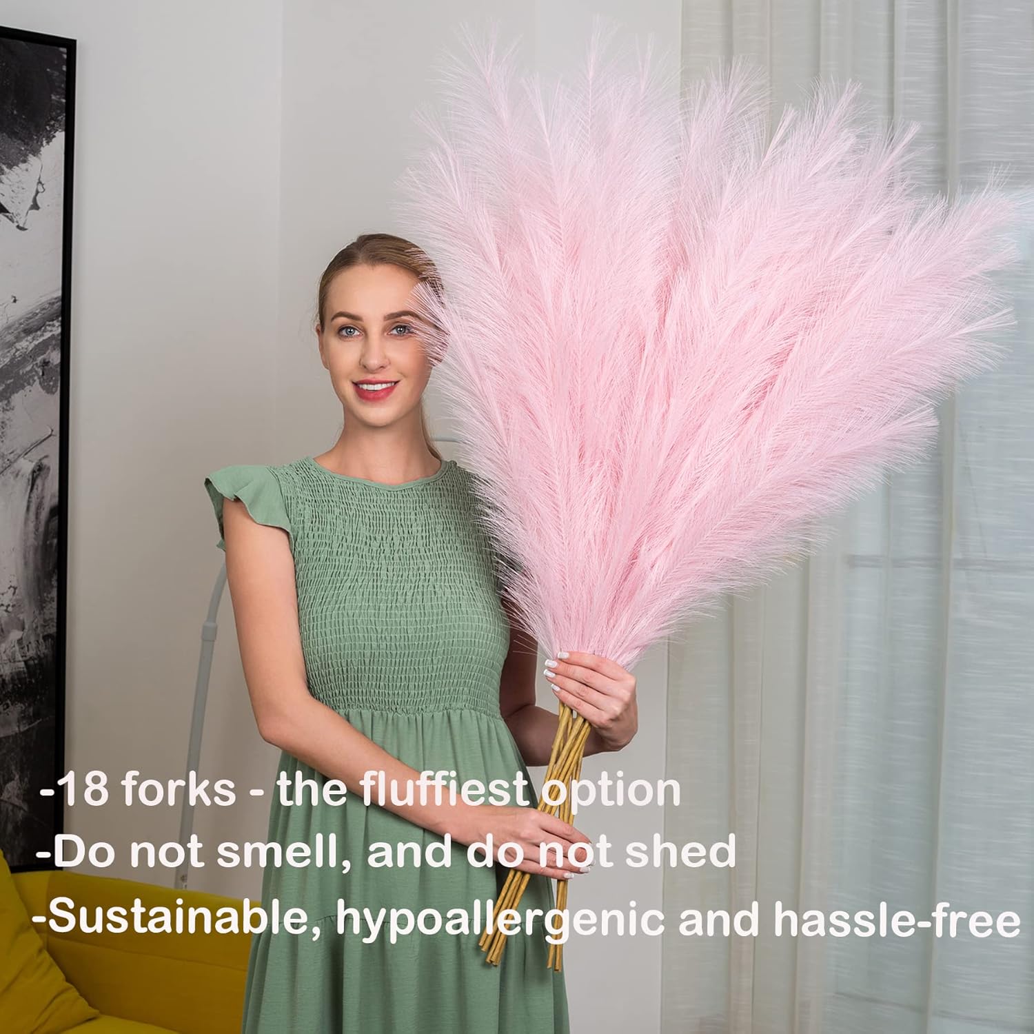- Great Alternative for Real Pampas: Unlike dried pampas grass, our pompous grass does not shed like the real version, the long fibers on each stick are tied so strongly that they do not fall off. No allergens, no smell, without the maintenance cleaning and will last a long time