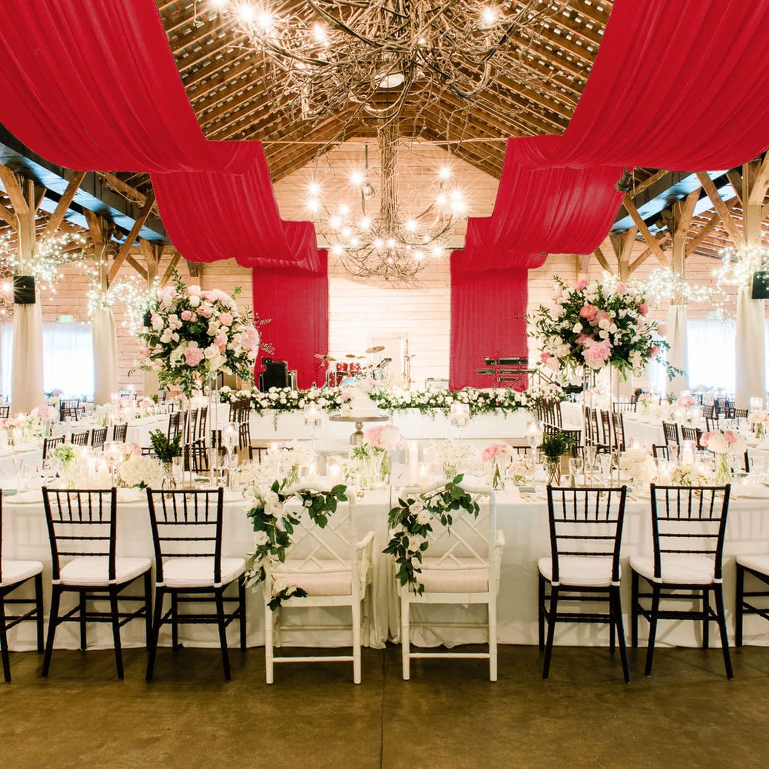 - âQuality Material - Ceiling Drapery for Wedding: The material of wedding arch draoes fabric is premium sheer chiffon fabric, silky soft and wrinkle-free, sturdy and reusable. More graceful than other nylon fabrics. All edges of red ceiling panels are finished with with nice stitching. The wedding arch drapery is a good choice for party decoations, giving your events an elegant and romantic look.