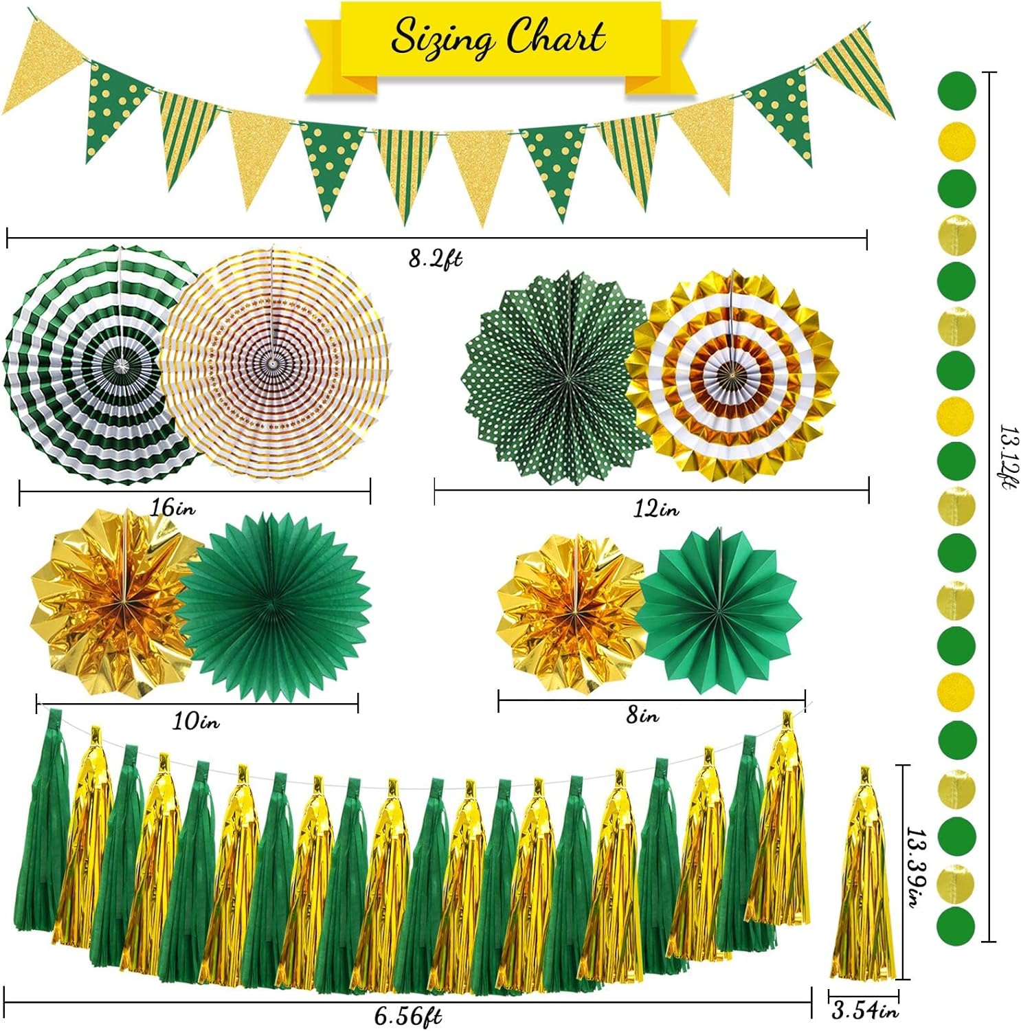 - Packing List: You will receive 13.14ft gold green circle banners x3, 8.2ft green gold triangle streamer x1, 20-piece green gold tassel garland x1, 8" paper fans X2, 10" paper garlands fans X2, 12" round paper fans X2, and 16" hanging papers fan X2, which will be a great help to brighten up your themed birthday party with these stylish party decorations, Easily create a strong party atmosphere in your house