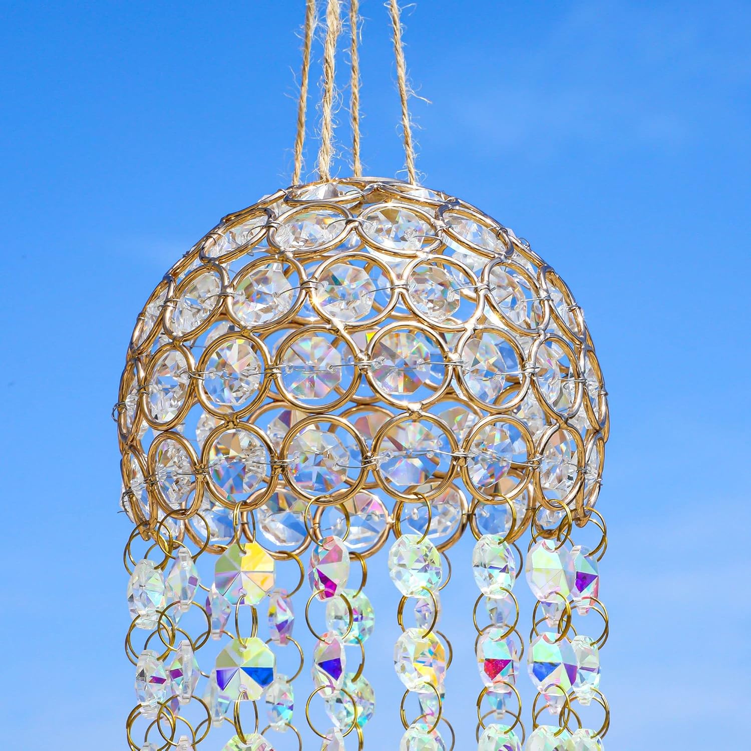 - Make-up - This crystal chandelier wind chime is made by high quality K9 grade ab color coating crystal glass suncatcher prisms and beads, gold plated sun/moon/leaf charm and metal suncatcher frame,hanging hemp rope and metal hook