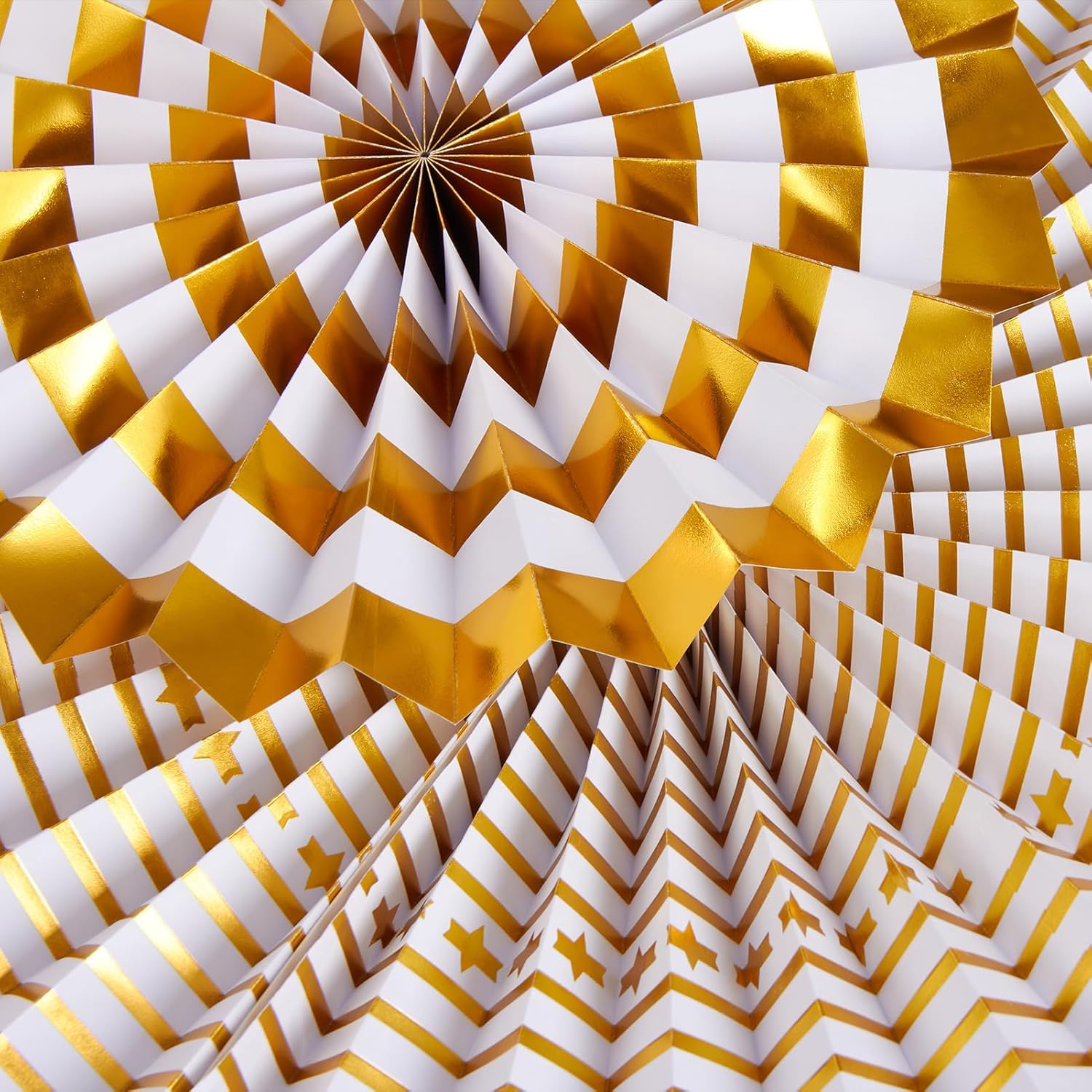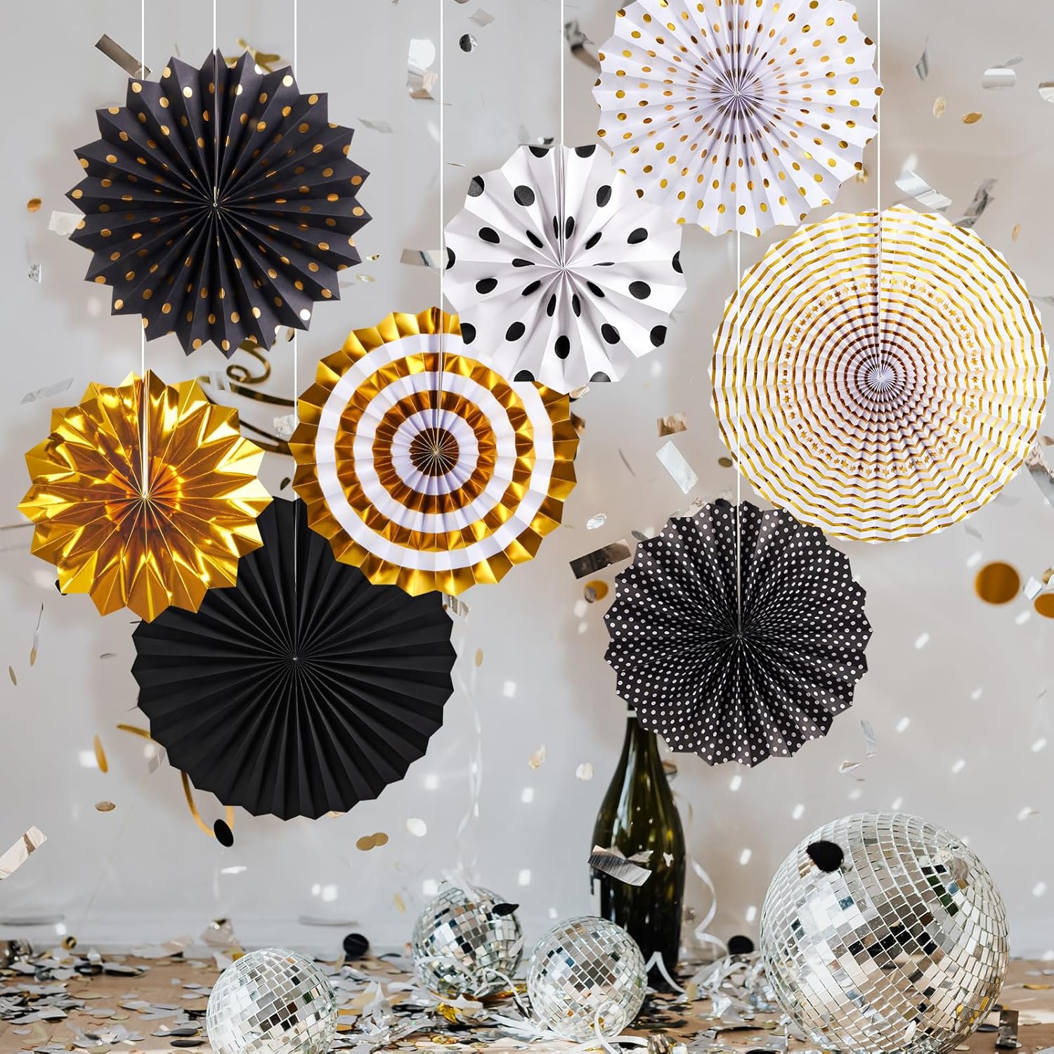 SUNBEAUTY Gold Black Paper Fans Backdrop for Tea Party Weddding Spring Birthday Classroom Baby Shower Halloween Decoration Hanging Home Party - 8Pcs