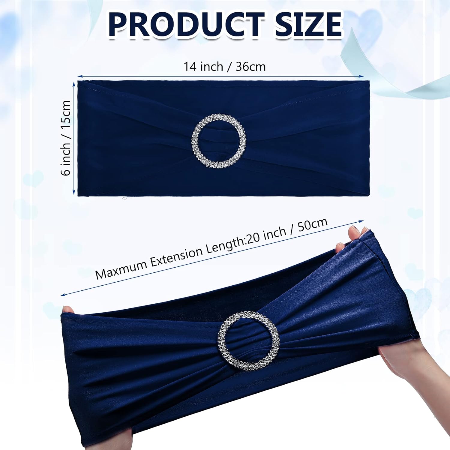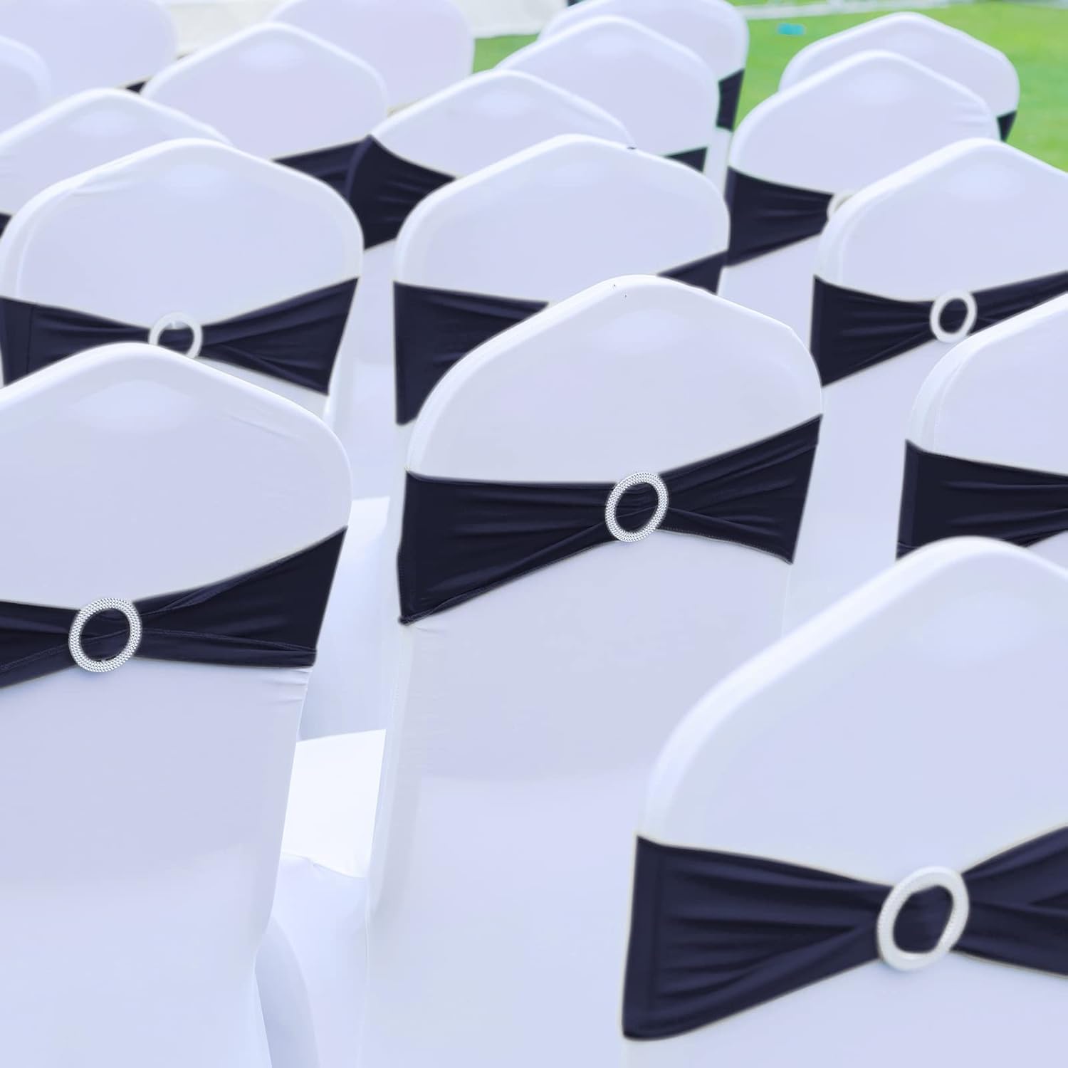 CHENGU 150 Pieces Spandex Stretch Chair Sashes Bows Elastic Chair Cover Bands Ties with Buckle Slider for Wedding Party Reception Events Universal Ceremony Banquet Decorations (Dark Blue)