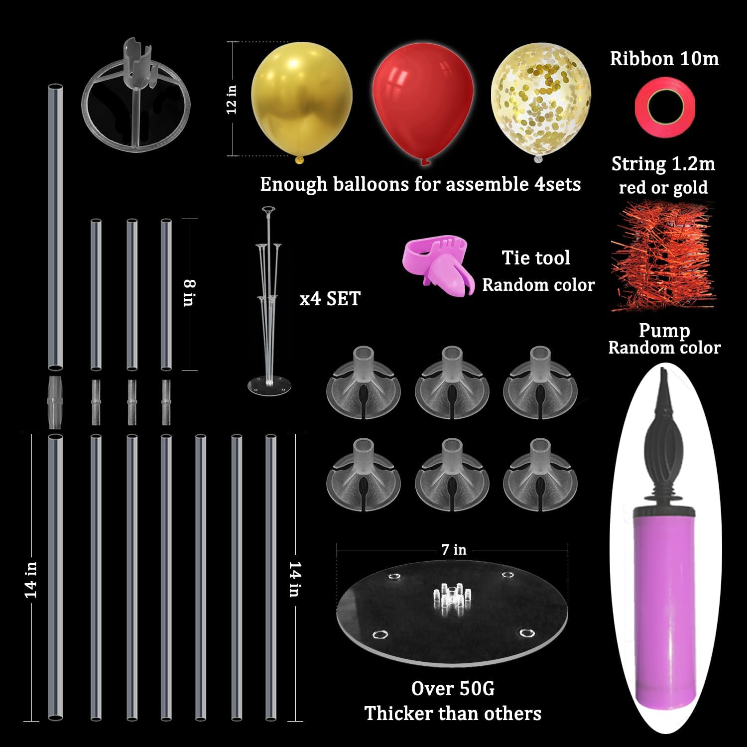 - WHAT INLCUDE: This balloon stand kit include 4 set balloon holders, 35 pcs balloons - red and gold balloons, gold confetti balloons, balloon pump, ribbons, glue dots and tie tool