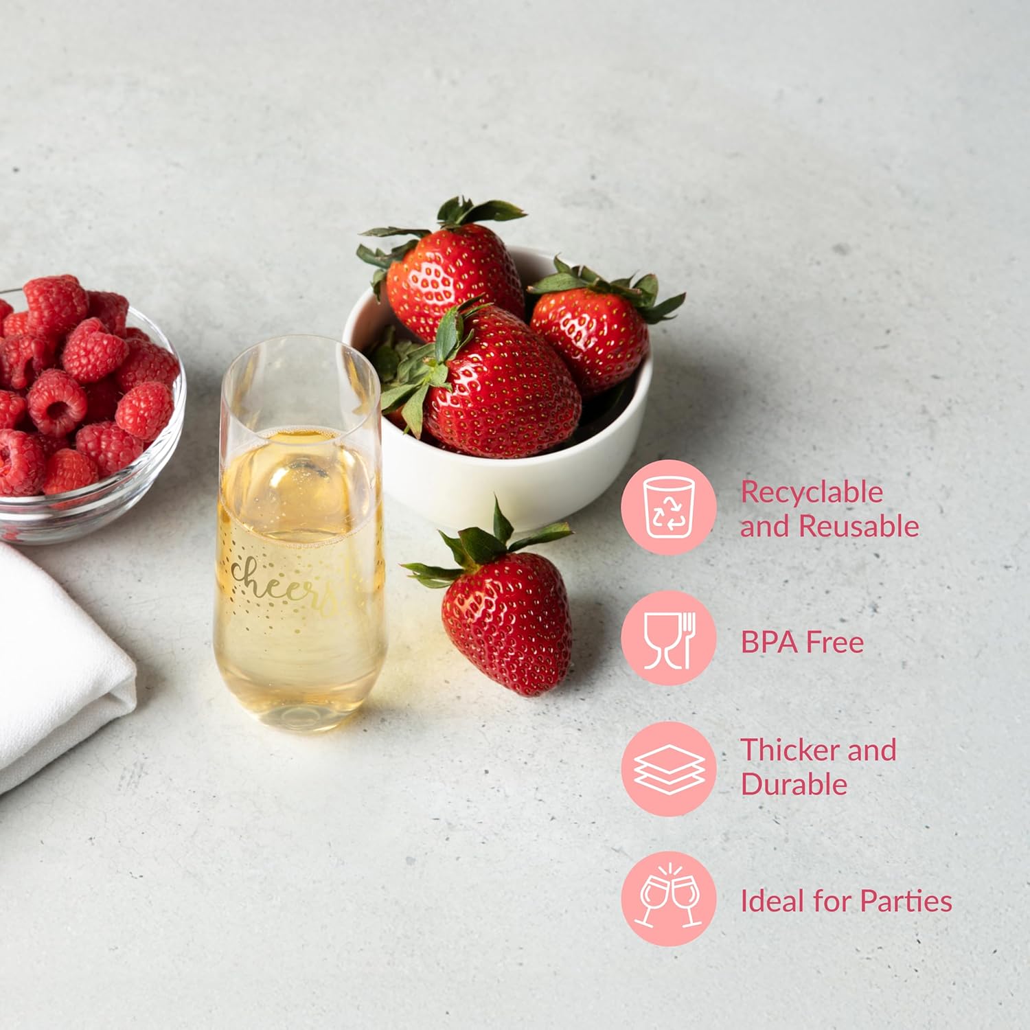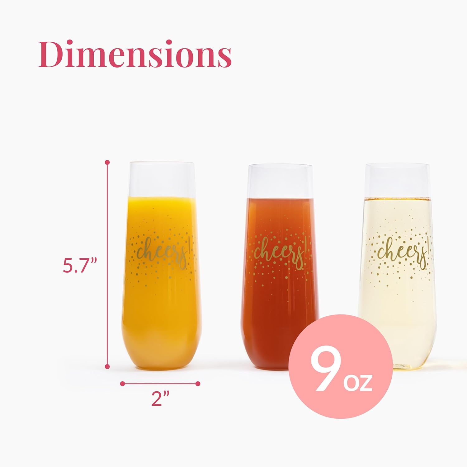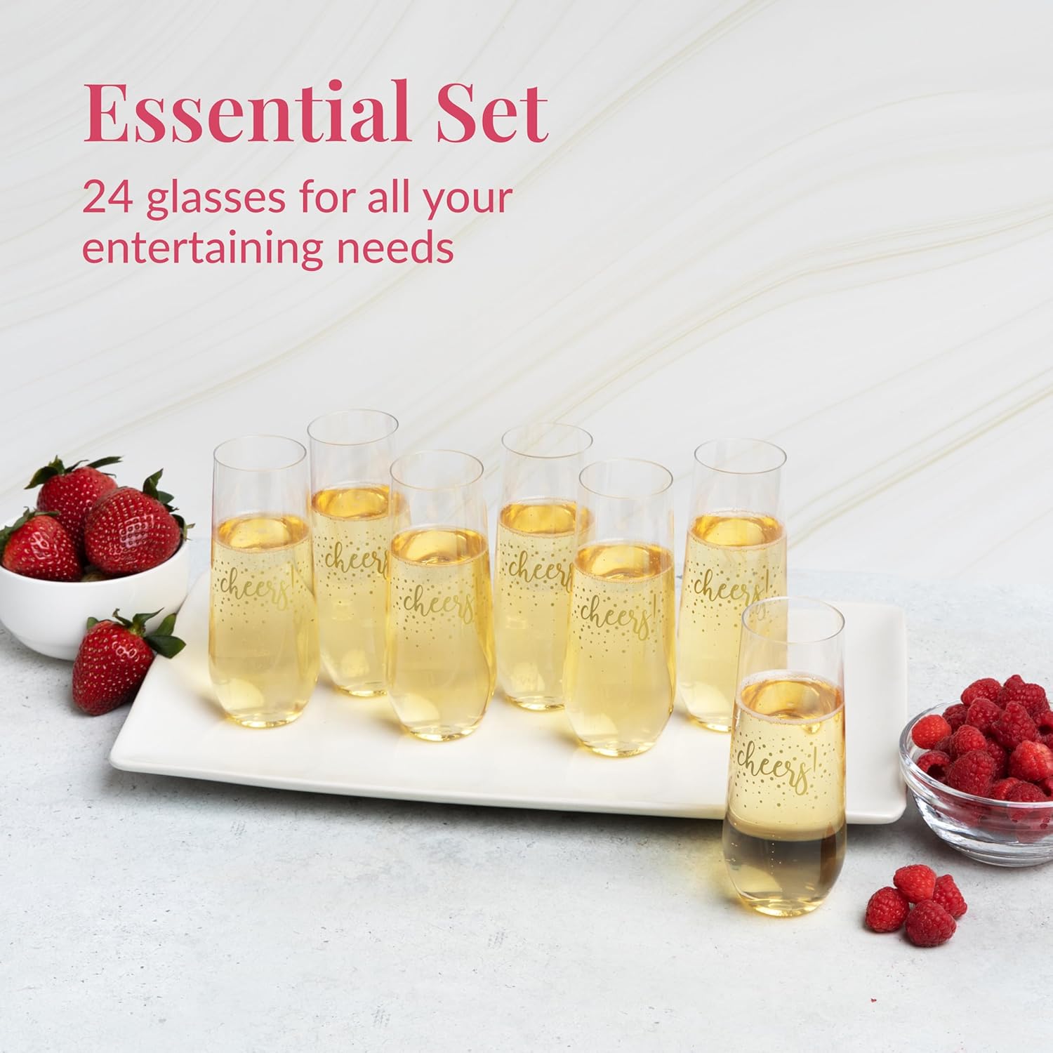 - WHAT'S INCLUDED: Set of 24 shatterproof 9oz stemless champagne flutes designed with Cheers text to hold wines, champagnes, sparkling drinks etc.
