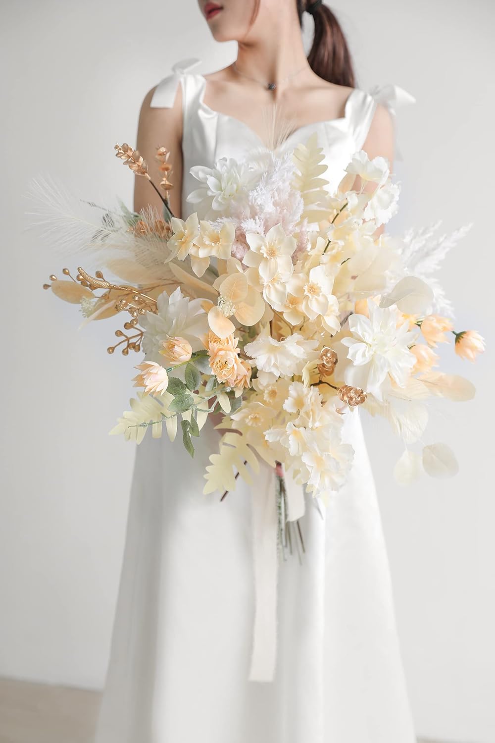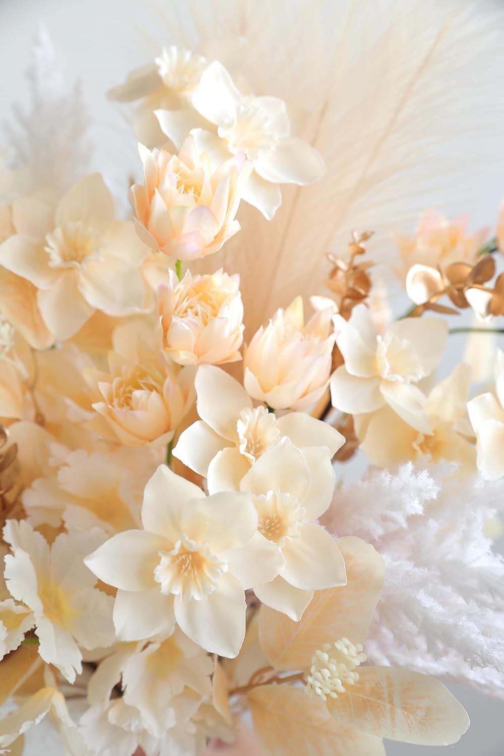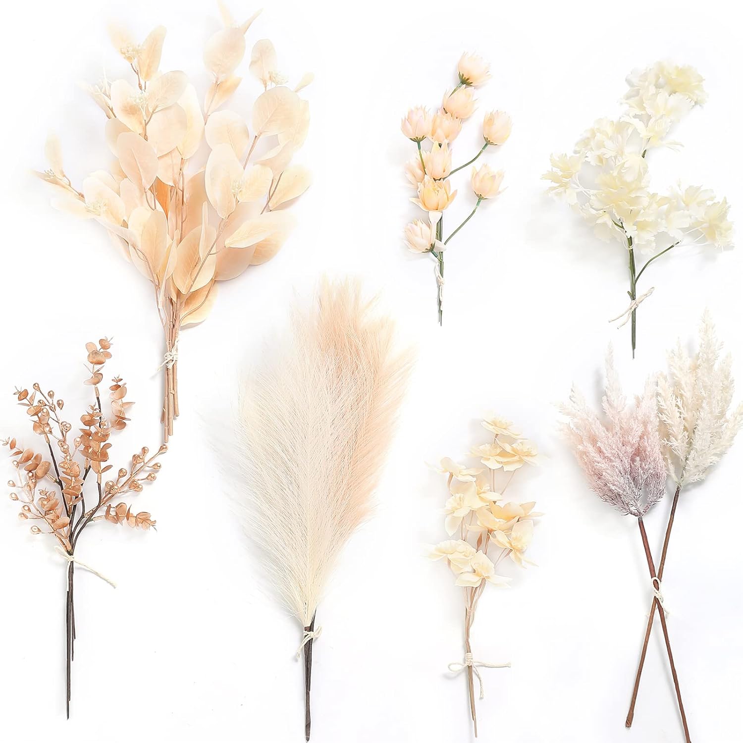 - 19pcs with 7 Kinds;Champagne eucalyptus x4,campanula flowers x2,Light yellow and khaki pampas grass x2,white & dusty rose pampas grass x2.daffodils flowers x3.Champagne Carnation x2.baby eucalyptus and Golden berry x4,