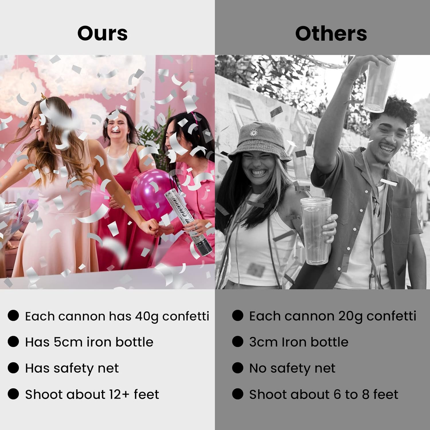 - π Ultra-Fun & Safe Confetti Cannon: Our confetti poppers are designed for your safety. They boast a safety net that keeps metallic parts from flying out while you are shooting and prevent accidents at the Christmas or New Year Eve party!