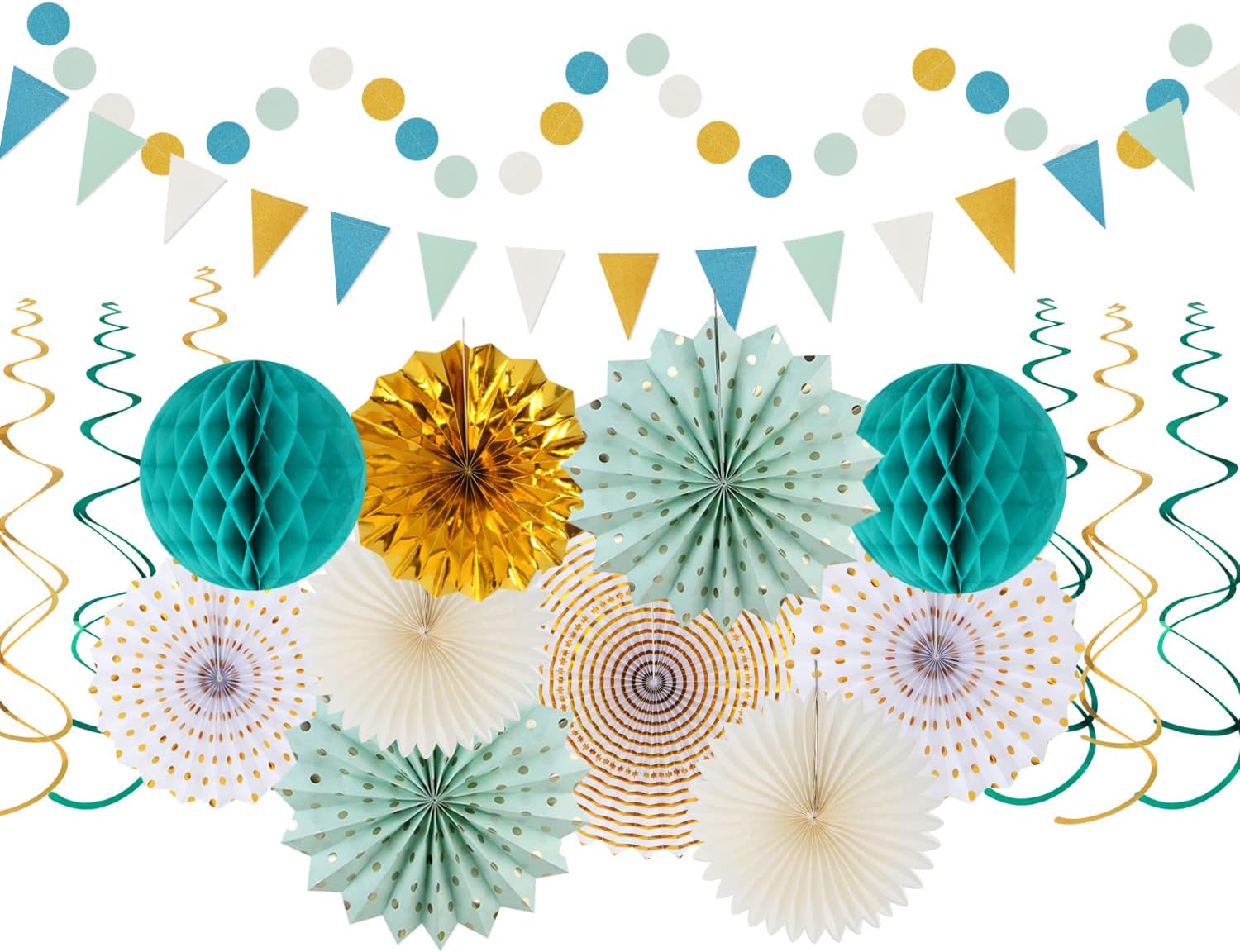 - Package Including:The teal-gold sage green party decorations 1pcs paper garland dots,1pcs Triangle Flags in three color,15pcs tassel garland in three color,2pcs Honeycomb ball,6pcs streamers in two color,4pcs 10” paper lantern fan in three color,3pcs 12”paper lantern fan in three color,1pcs 16”paper lantern fan.