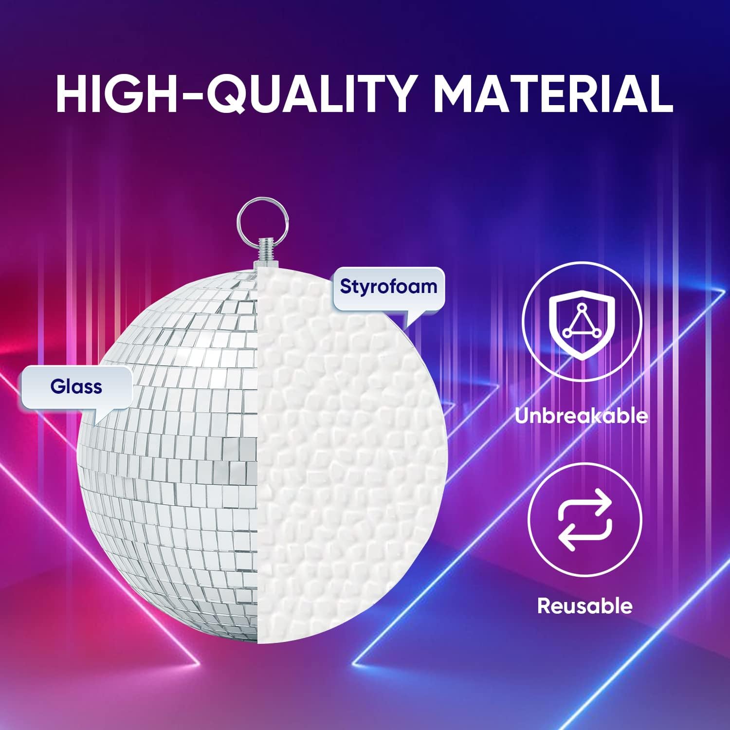 - Premium Silver Mirror Ball: This shimmery mirror ball is well-constructed with foam inner ball covered; When light is directed at mirror ball, each facet reflects light back into the air, casting it into dozens of small beams that stream out in all directions; The disco ball can create a unique, magical effect; The large disco ball have mirrored surfaces that refracts sunlight to fill the room with a warm glow , ideal for school dances, weddings and other big parties