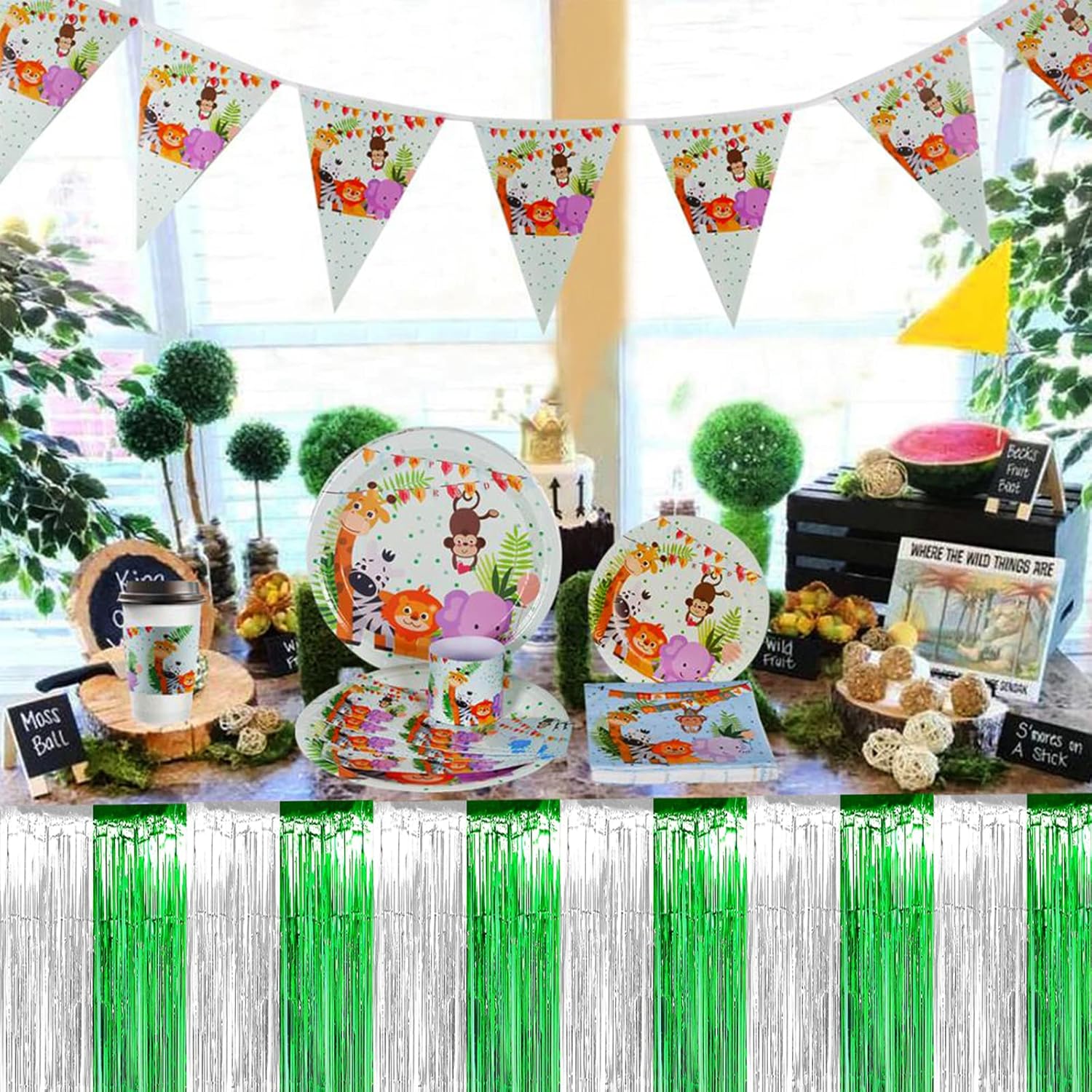4 Pack 29x108 Inch Metallic Foil Fringe Tinsel Table Skirts for Rectangle Tables Streamer Backdrop for Wedding, Birthday, Parade Floats, Christmas, Halloween Party Decoration(Silver Green)
