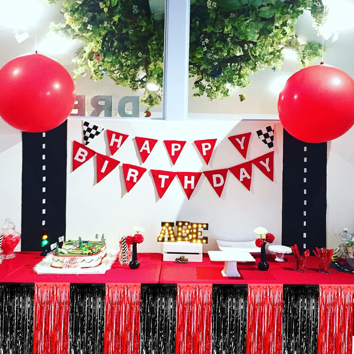 4 Pack 29x108 Inch Metallic Foil Fringe Tinsel Table Skirts for Rectangle Tables Streamer Backdrop for Wedding, Birthday, Parade Floats, Christmas, Halloween Party Decoration(Black Red)