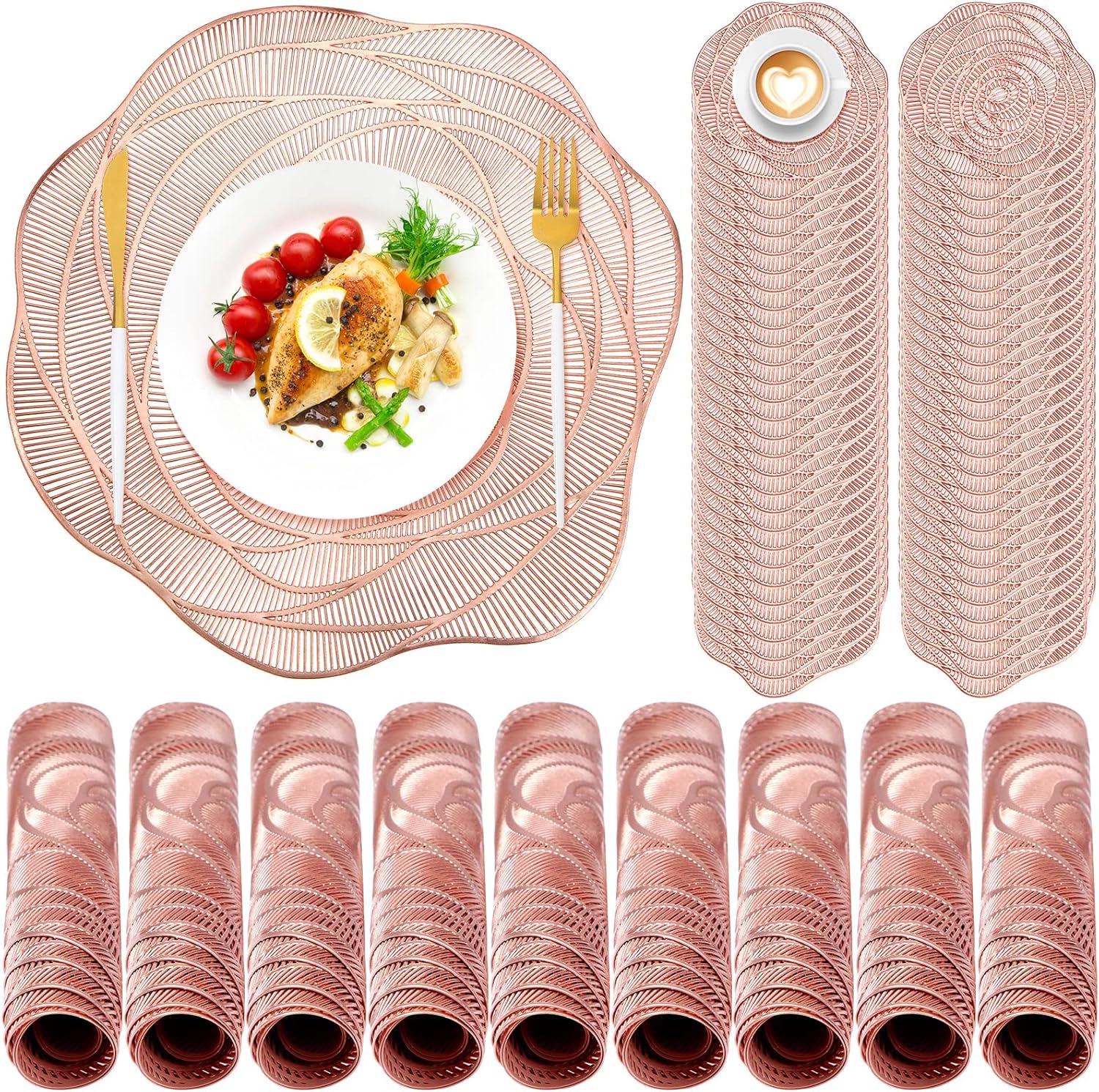 Sieral 48 Set 15 Inch Round Pressed Vinyl Placemats Hollow Out Rose Placemat Set Metallic Slip Resistant Place Mat Coaster Including Place Mats and Coasters for Wedding Dining Kitchen (Rose Gold)