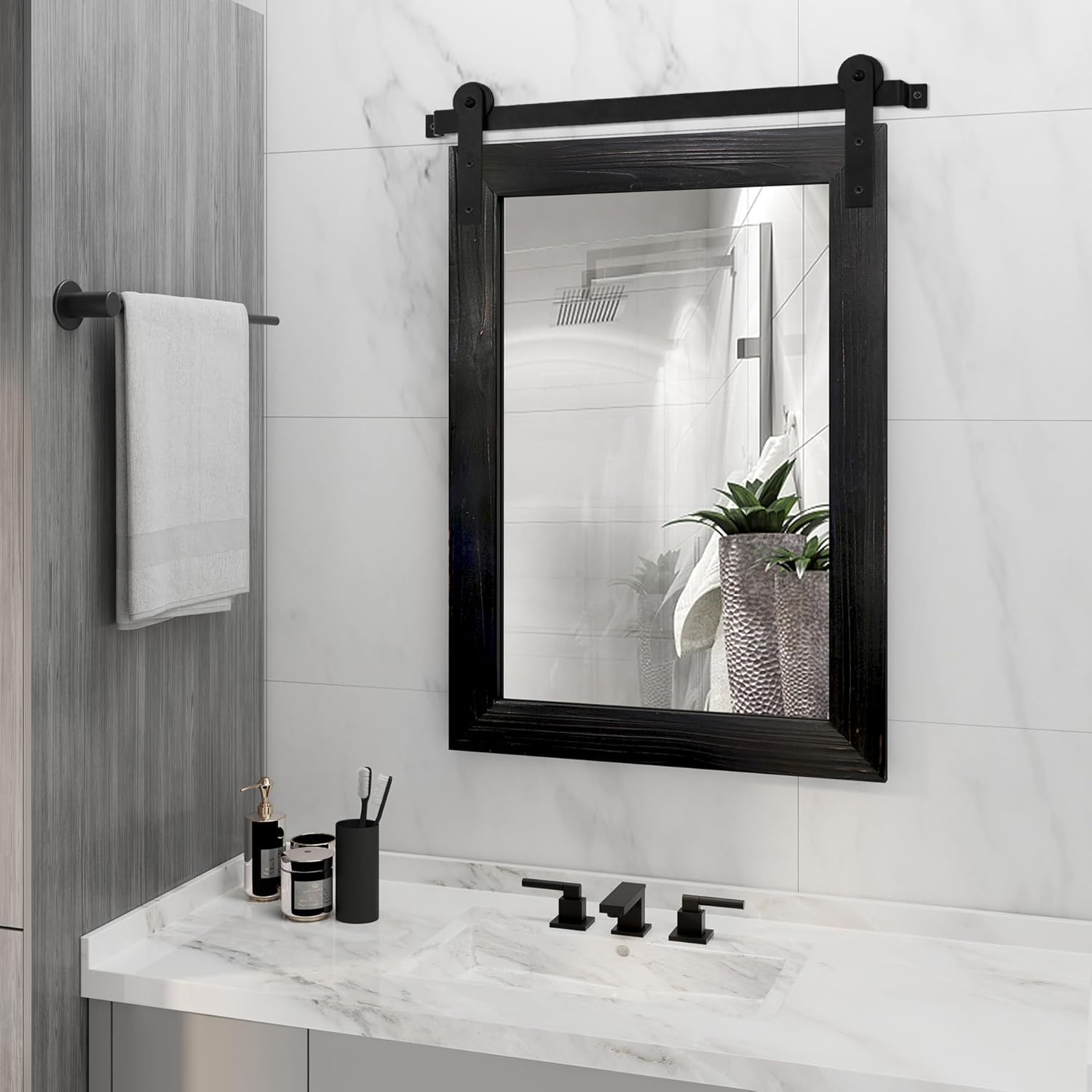 COGOOD Farmhouse Barn Door Mirror - 21 x 30 Rustic Wood Framed Wall Mirror for Bathroom, Living Room, Entryway Wall Decor (Black)