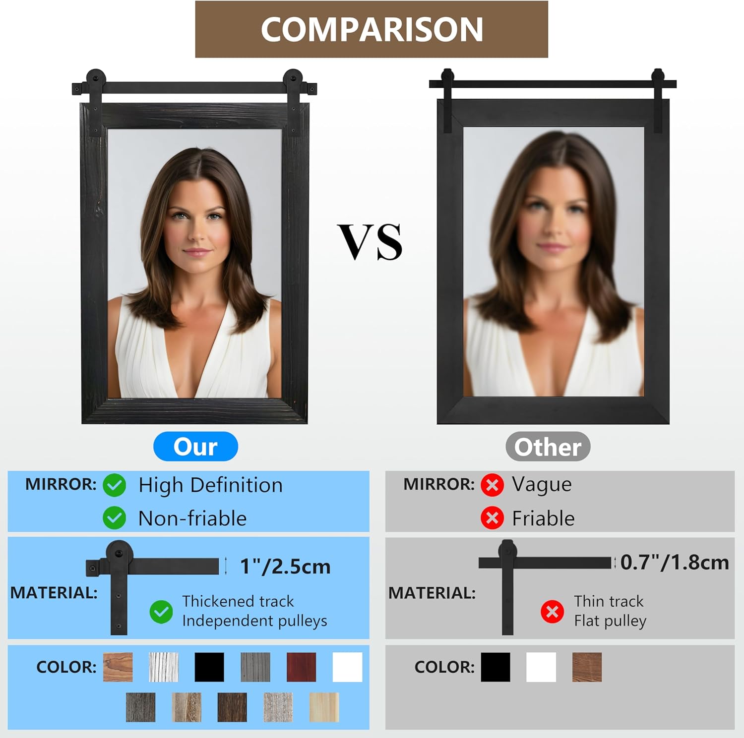 - QUALITY MATERIALS: The frame of the barn door mirror consists of an antique solid wood frame and a sturdy metal bracket. The interior features a 4mm HD silver mirror with clear and distortion-free reflections, providing a better sense of light and projection in your space