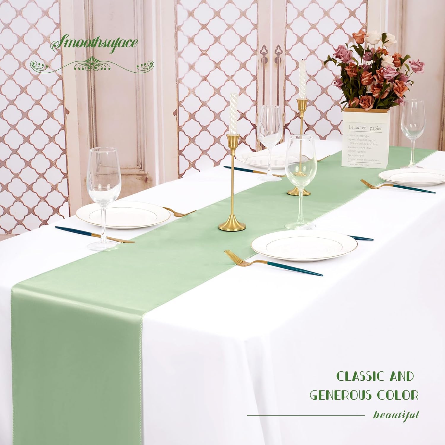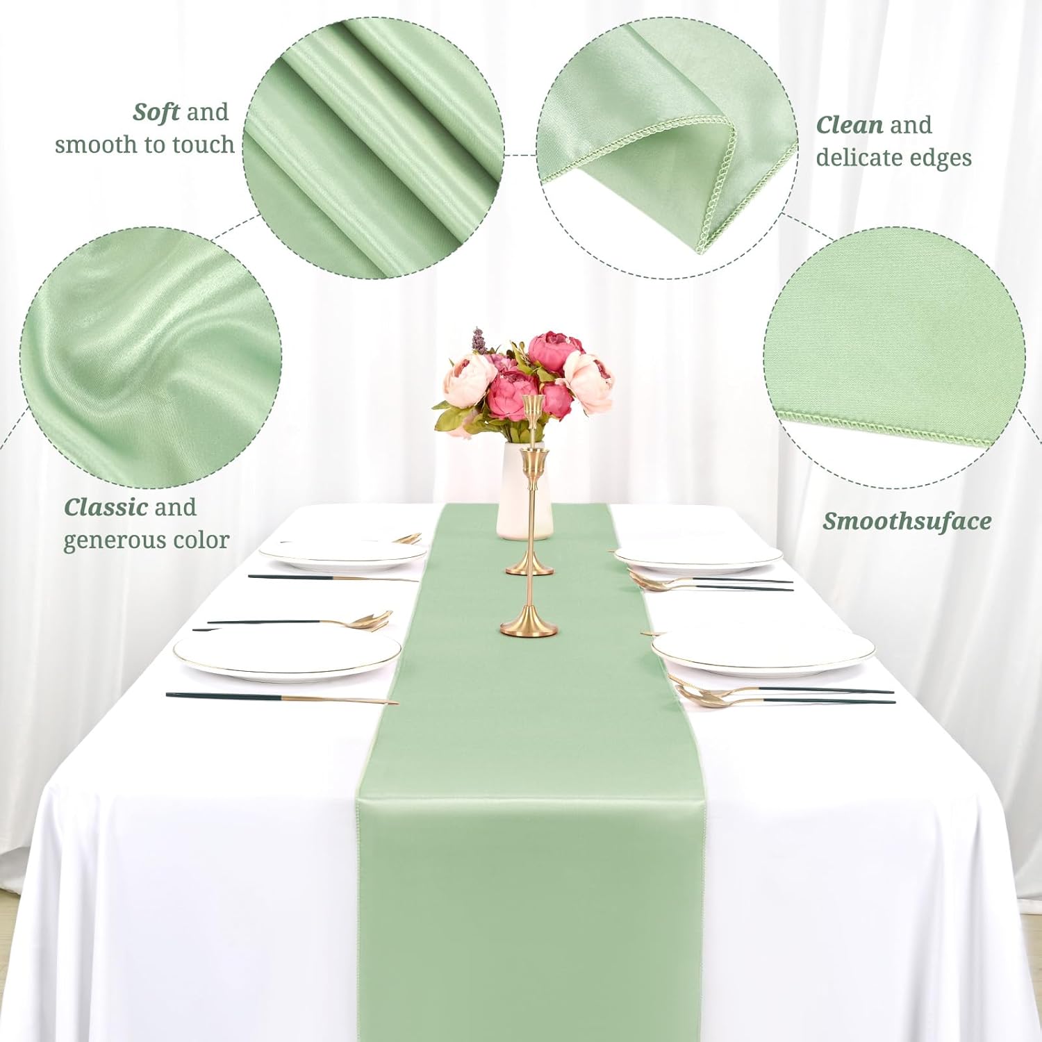 - 🍀【Perfect Finish】Sage satin table runner is made of delicate satin with smooth appearence.Neat seams with a clean look.Seamless, wrinkle-free, lightweight.Our satin table runners feature a refined, a solid color with an exquisite satin sheen that creates simple elegance.The seamless one-piece design making your party decorations shine when you add this silky-smooth runner on your table top.It's a great way to make your centerpieces and candles pop!