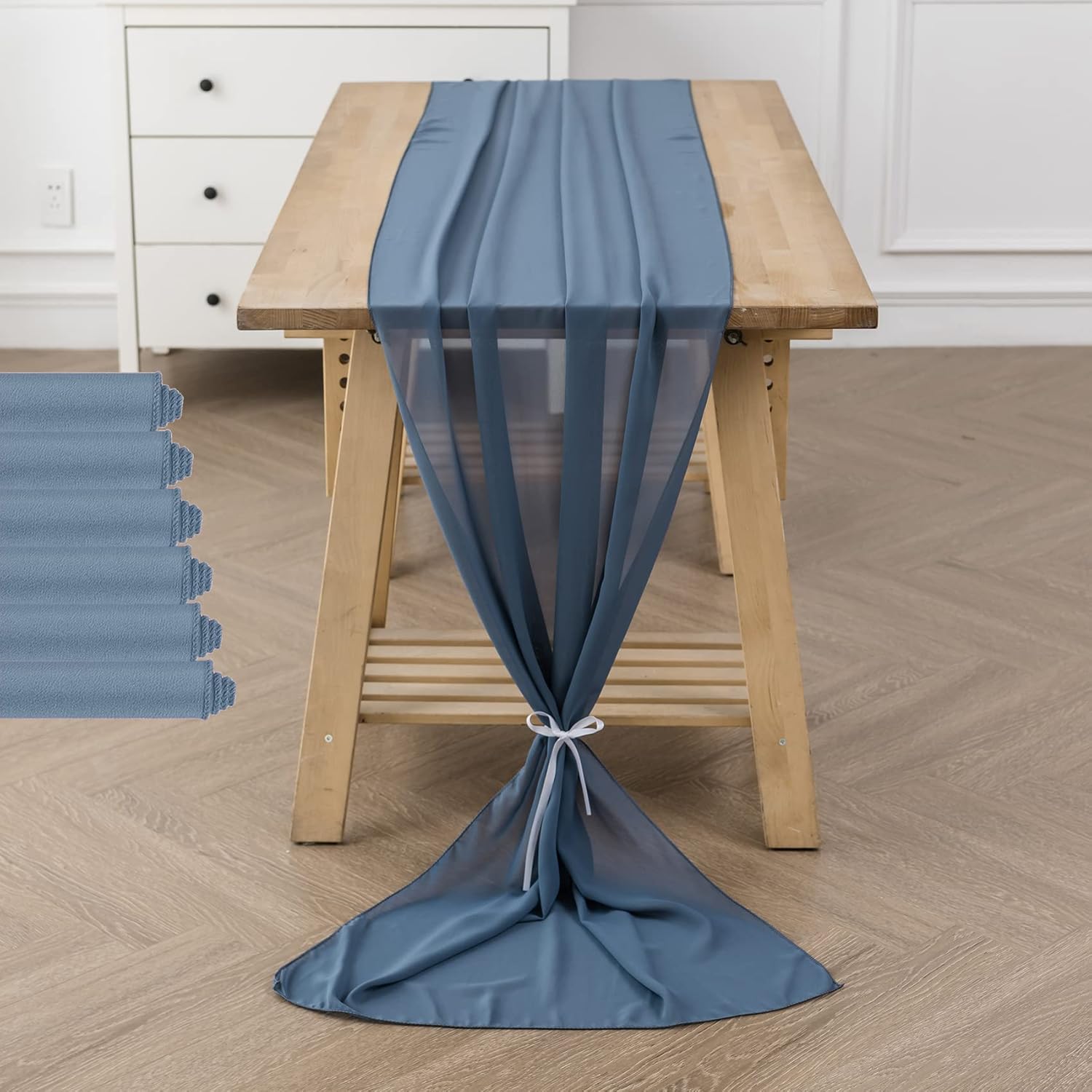 - Style:This colorful chiffon table runner has a flowy and elegant look,tie this romantic white sheer table runner up to create beautiful folds or leave it flowing loose onto the floor,add a luxurious feel to your special events.