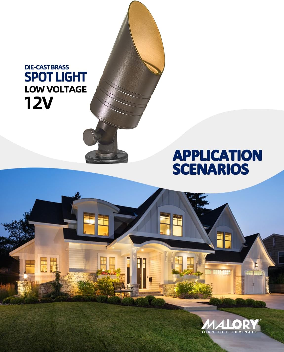 - BRASS LIGHT FIXTURE:MALORY landscape spotlight is constructed of die-cast brass for durability and beauty.Brass spot light doesn't corrode,more durable and reliable than aluminum and plastic fixtures,ideal for any uplighting application.Simple design structure for the light fixture make it looks beautiful yet unobtrusive in any landscape,suitable for decorating most houses and yards.