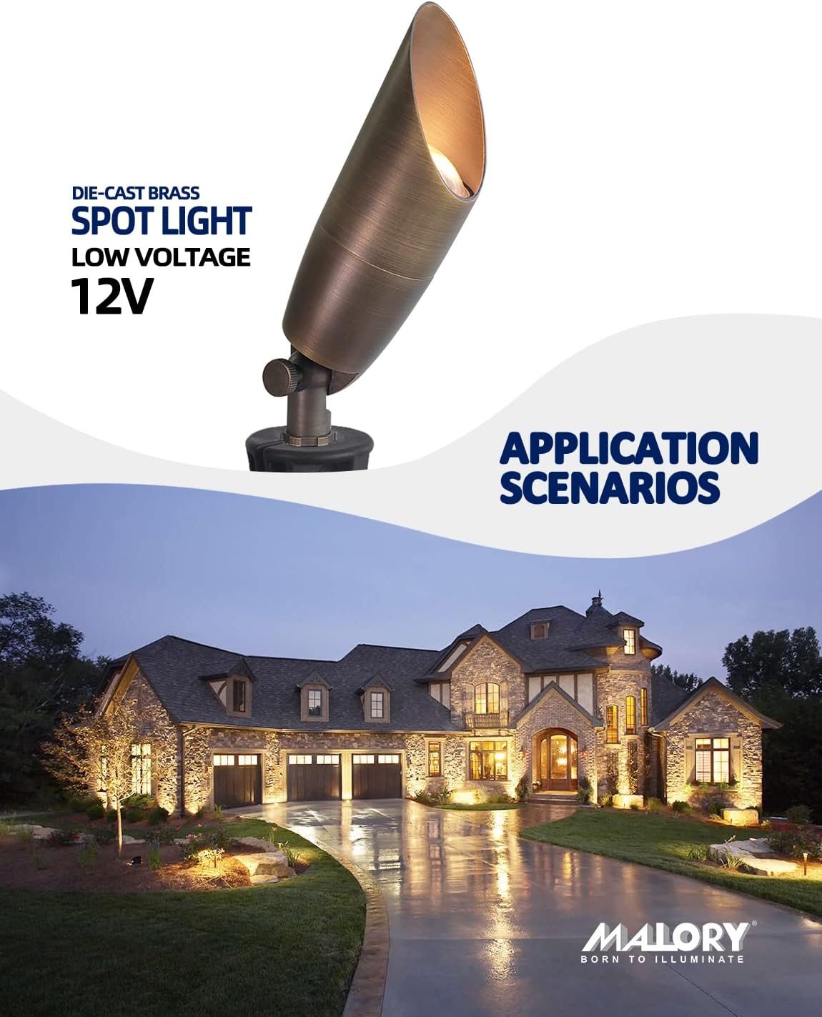 - BRASS LIGHT FIXTURE:MALORY landscape spotlight is constructed of die-cast brass for durability and beauty.Brass spot light doesn't corrode,more durable and reliable than aluminum and plastic fixtures,ideal for any uplighting application.Simple design structure for the light fixture make it looks beautiful yet unobtrusive in any landscape,suitable for decorating most houses and yards.
