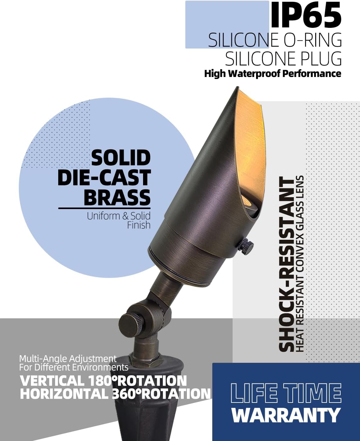 MALORY Brass Landscape Spotlight 6-Pack with MR16 Bulb Kit(S04), Low Voltage 12V AC/DC Shroud Adjustable Outside Yard Lights,PVC Ground Stake and Wire Connector Included, 5W 2700K Warm White