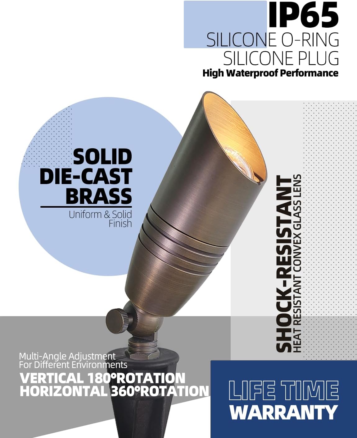 - BRASS LIGHT FIXTURE:MALORY landscape spotlight is constructed of die-cast brass for durability and beauty.Brass spot light doesn't corrode,more durable and reliable than aluminum and plastic fixtures,ideal for any uplighting application.Simple design structure for the light fixture make it looks beautiful yet unobtrusive in any landscape,suitable for decorating most houses and yards.