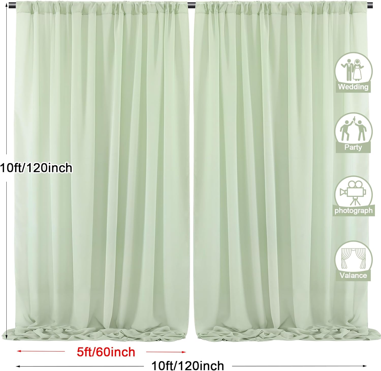 - 2 Panels Backdrop Drapes: Come with 2 panels Sage Green chiffon backdrop curtains,each panels size is 5ft width and 10ft height. Combined, entire backdrop curtains is 10ft*10ft. Please note: Not including the background stand