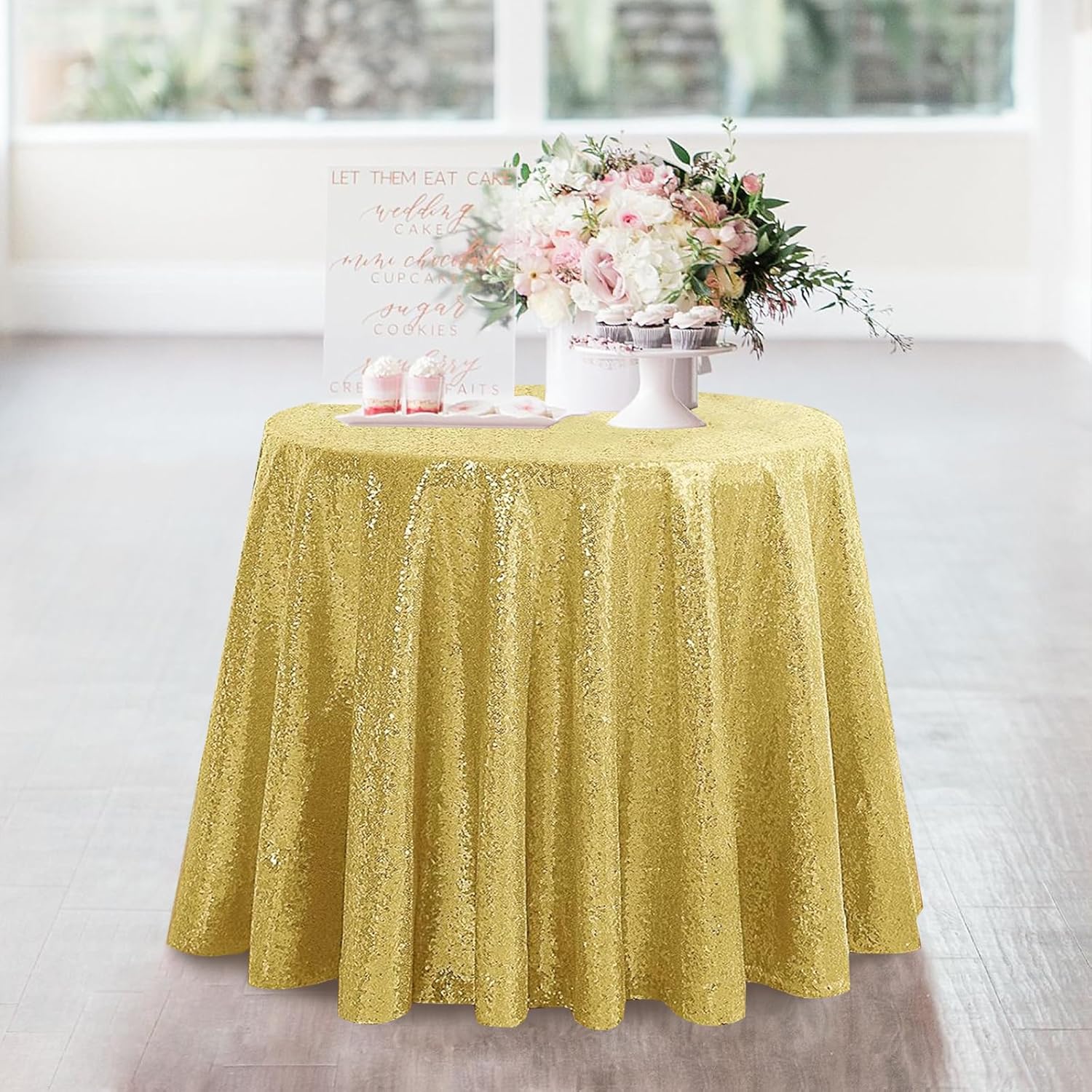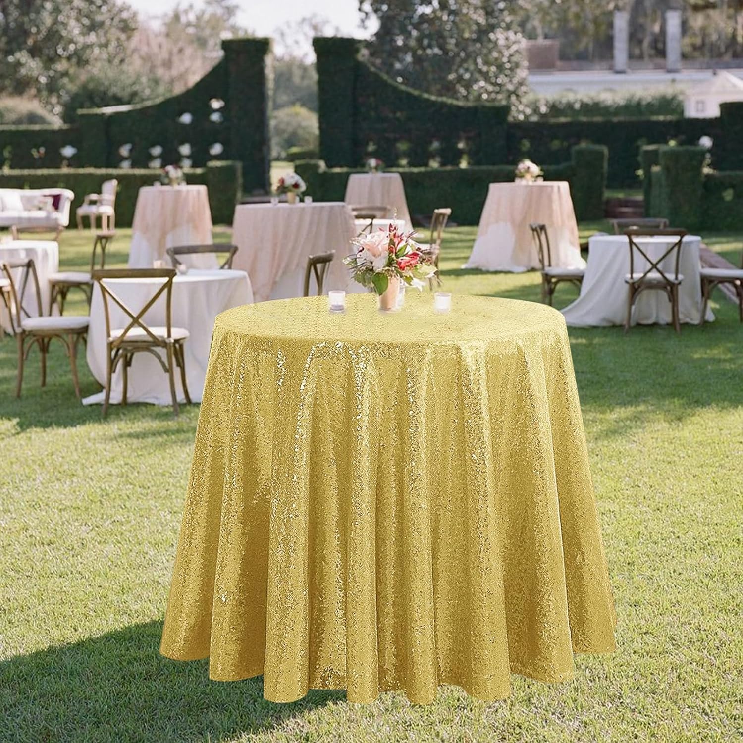 - Package Include: Your package will include 1 round gold tablecloth measuring 50 W by 50 L inch. These sparkly table tablecloths are ideal for wedding, event table decorations for the reception.