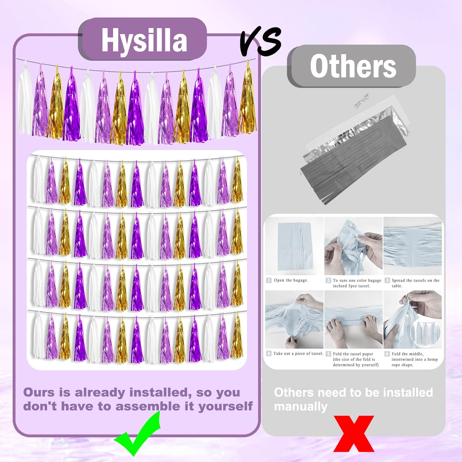 - 【White Light Purple Purple Gold Party Supplies Set】: The total length of the white light purple purple gold birthday tassels banner is 26.2 feet, divided into 4 strips, each 6.5 feet long. Each banner contains 15 tassels, and each tassel measures 14 inches, for birthday decorations many occasions, and so on