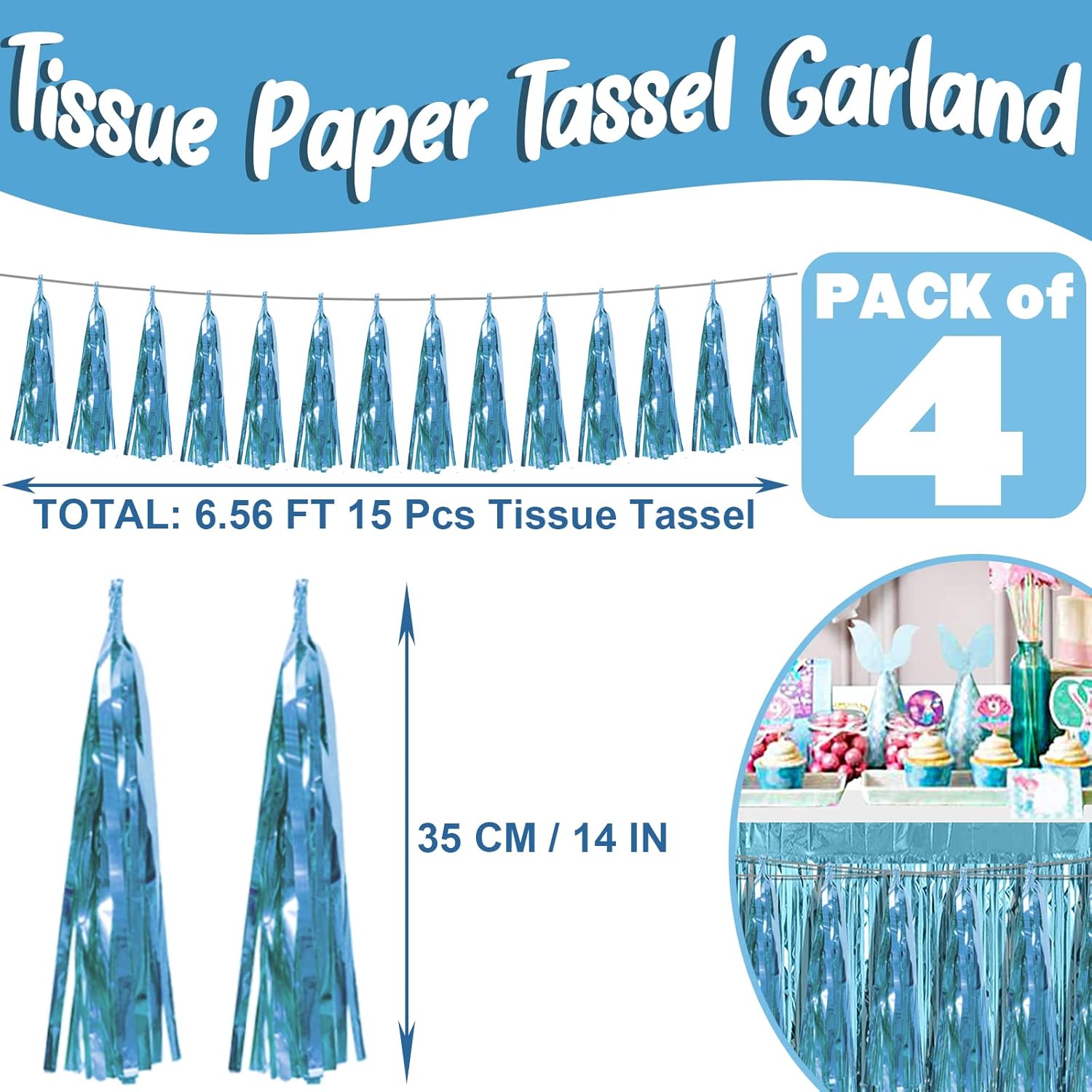 - 【Light Blue Party Supplies Set】: The total length of the light blue birthday tassels banner is 39.3 feet, divided into 4 strips, each 9.8 feet long. Each banner contains 15 tassels, and each tassel measures 14 inches, for birthday decorations many occasions, and so on