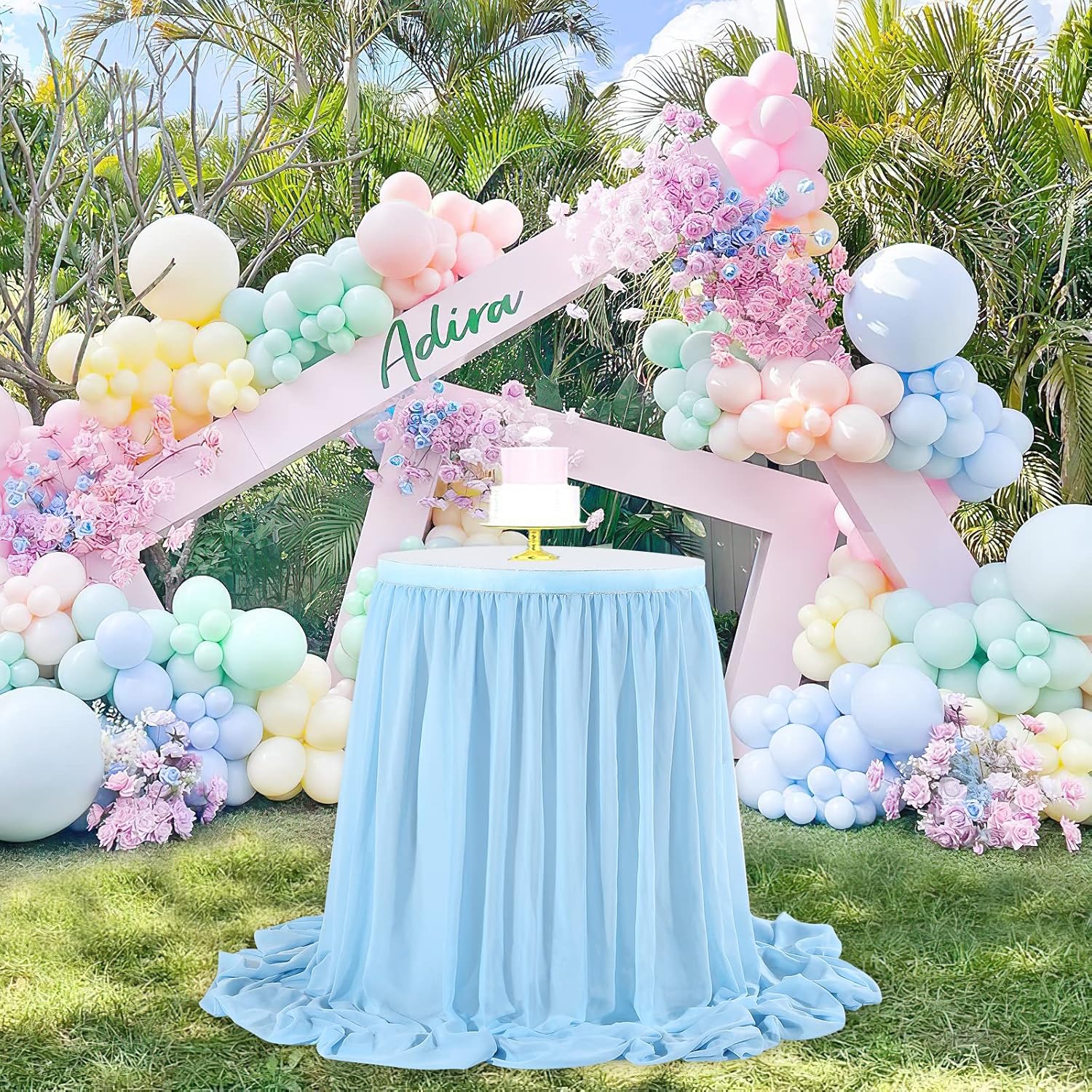 - π‘ Baby Blue Table Skirt Material: The extra long chiffon table skirt is made of Sheer Chiffon which is wrinkle-free, soft, and with a nice drapery. Table skirt both robust for kids birthday party supplies and elegant if used for wedding decoration.